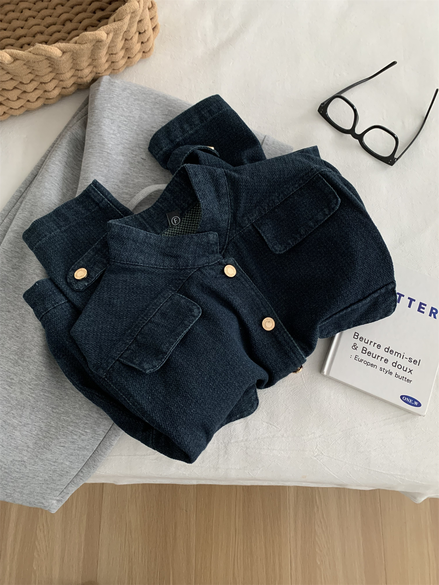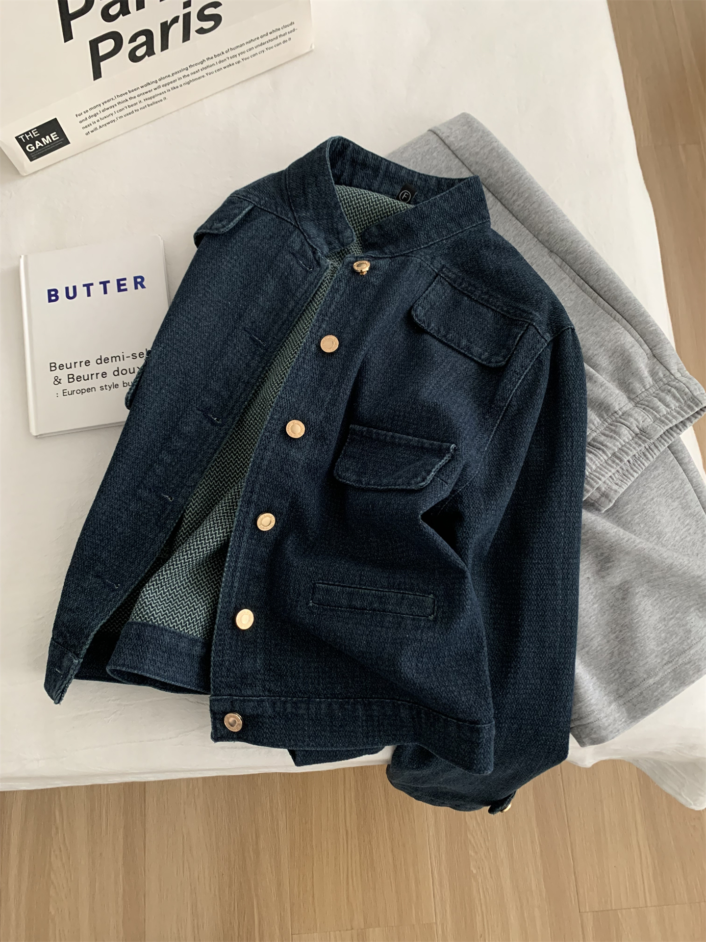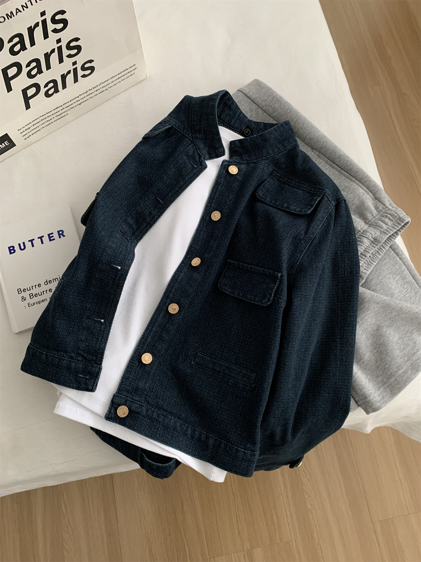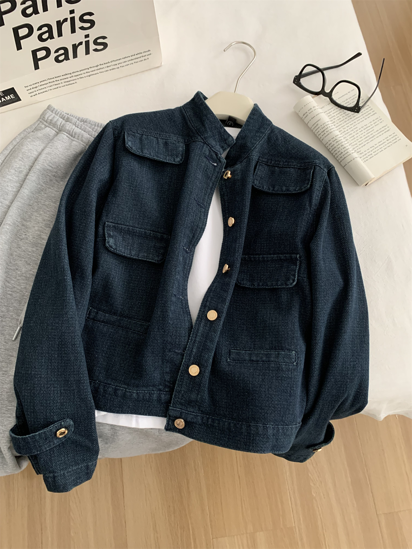 洋气复古小香风牛仔外套女水洗钴蓝色金扣立领小个子短款开衫春季