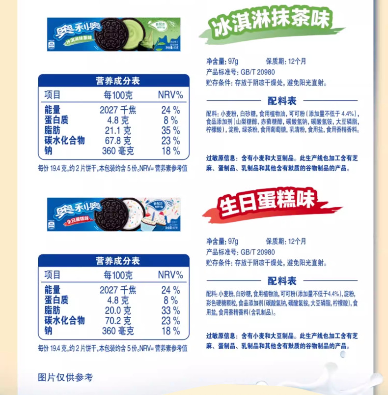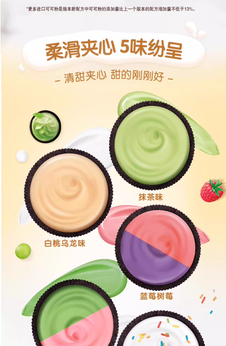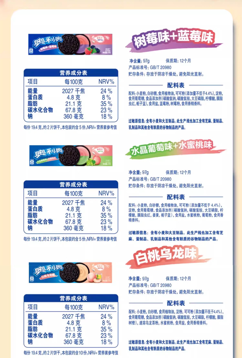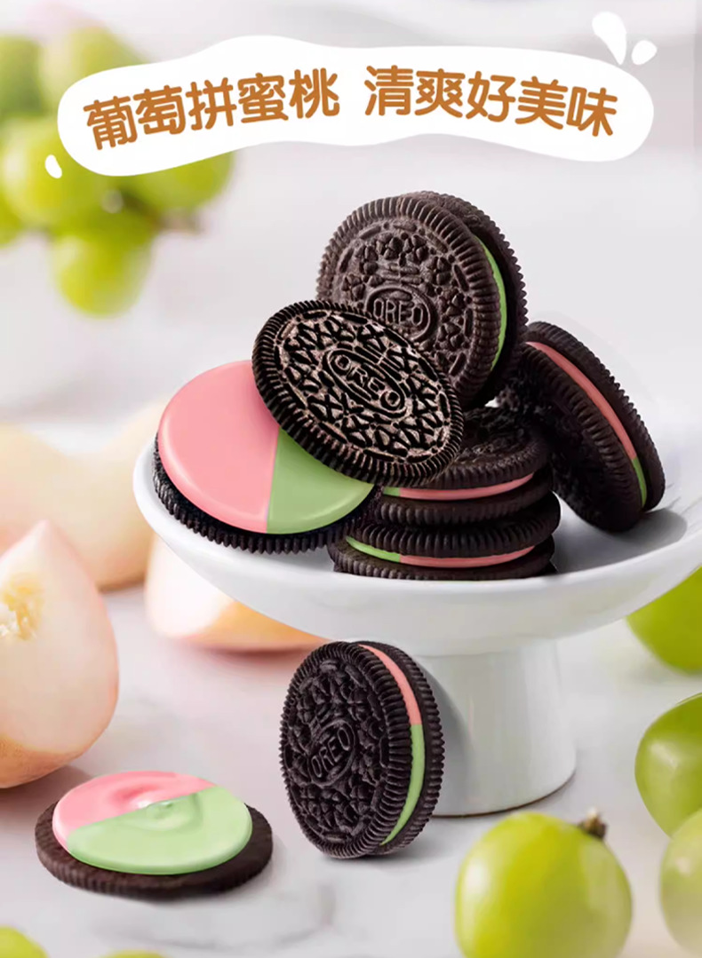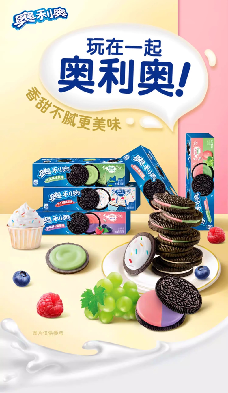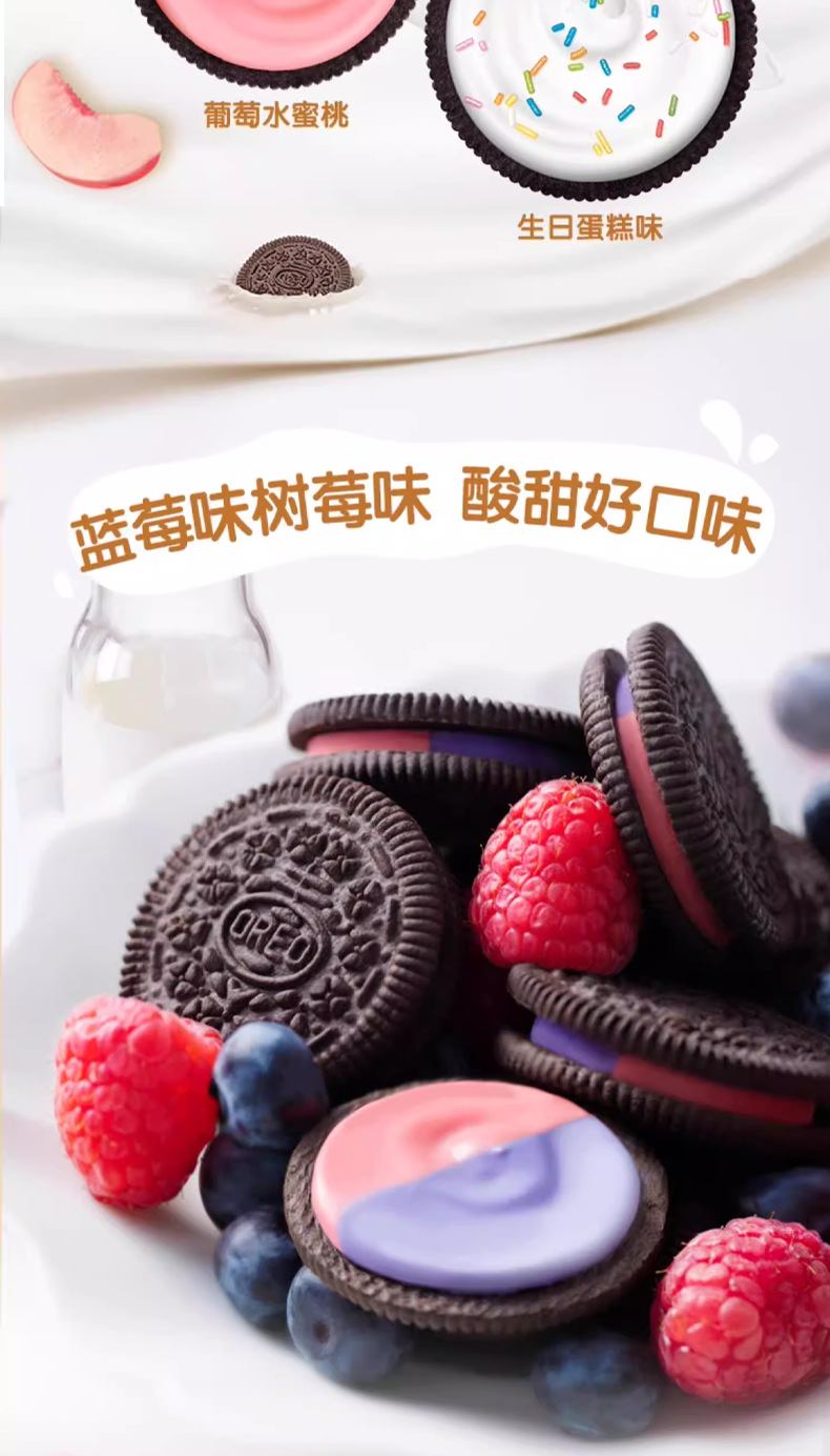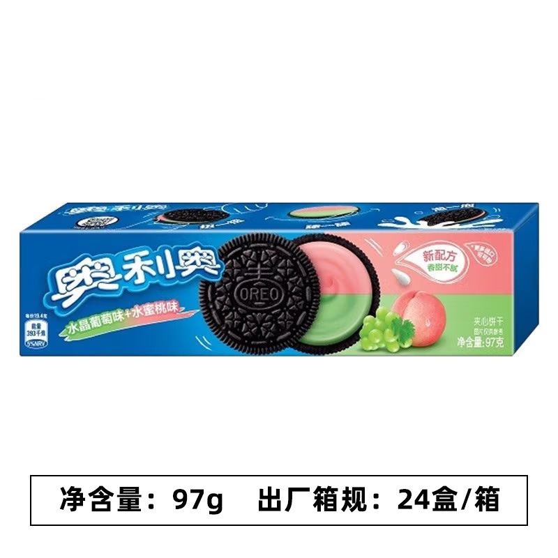 奥利奥夹心饼干缤纷葡萄+水蜜桃97g; 奥利奥夹心饼干缤纷树莓+蓝莓97g; 奥利奥夹心饼干冰淇淋抹茶味97g; 奥利奥夹心饼干白桃乌龙味97g; 奥利奥夹心饼干经典原味97g; 奥利奥夹心饼干浓醇巧克力味97g; 奥利奥夹心饼干清新草莓味97g; 奥利奥夹心饼干生日蛋糕味97g