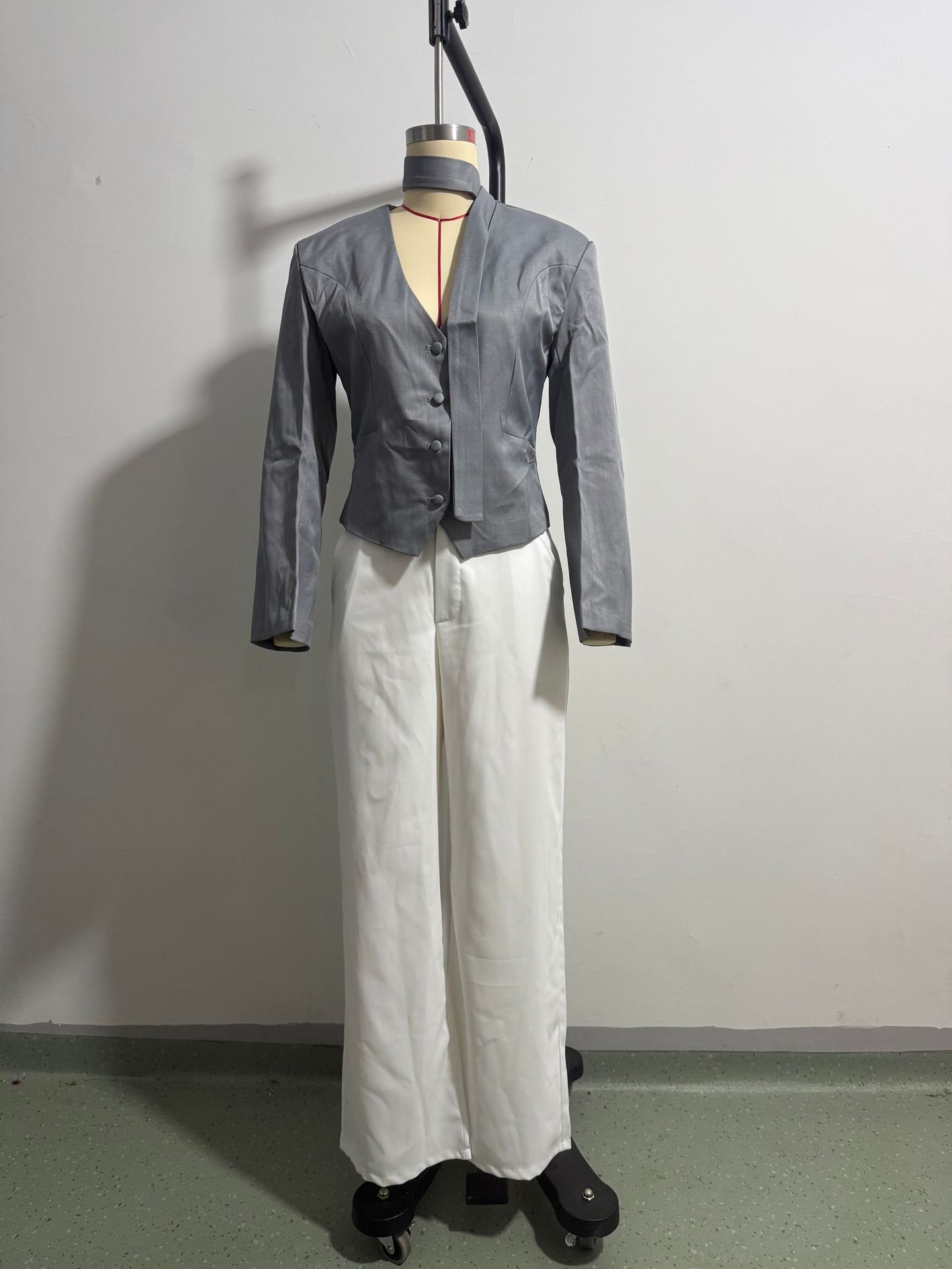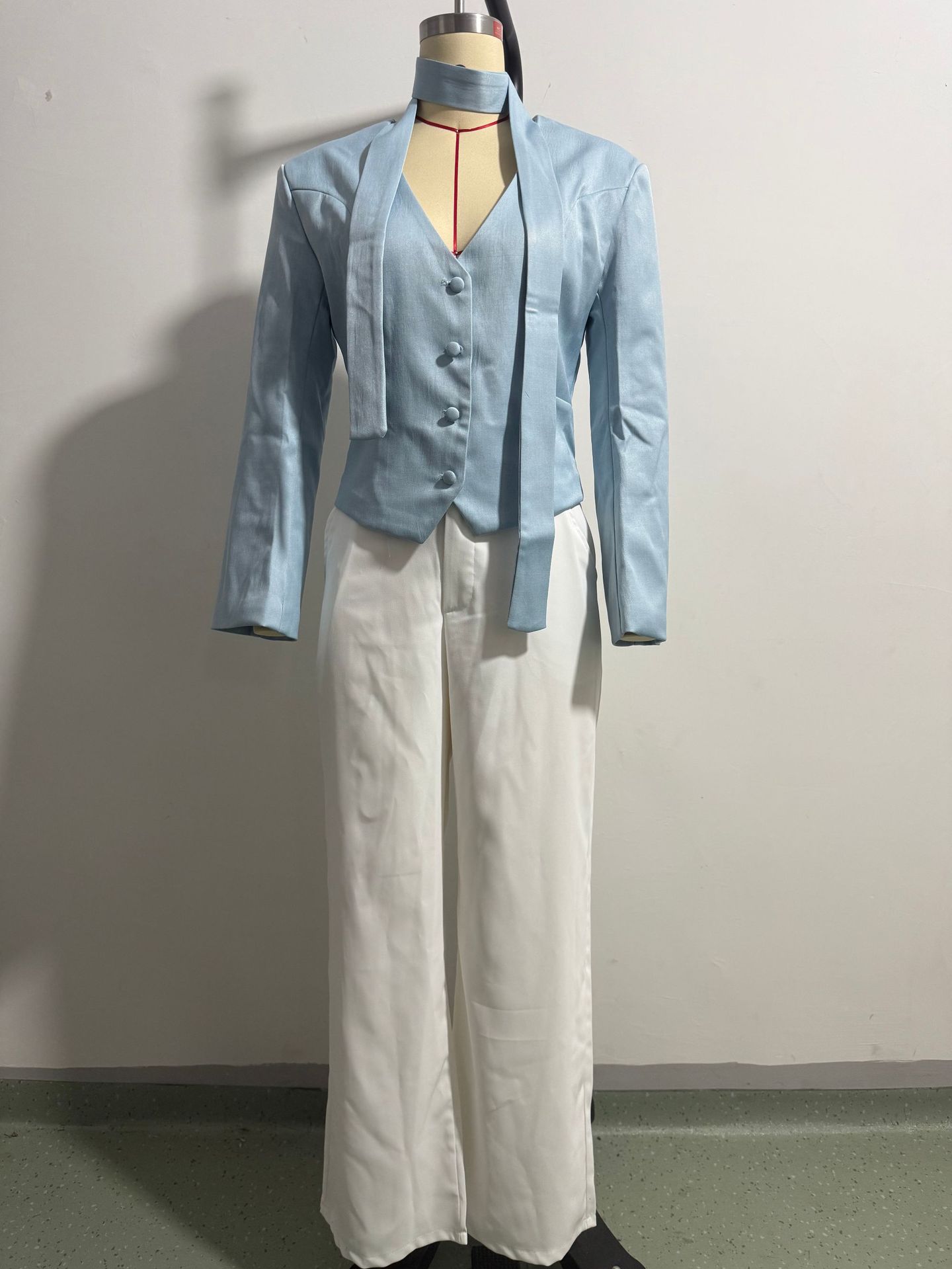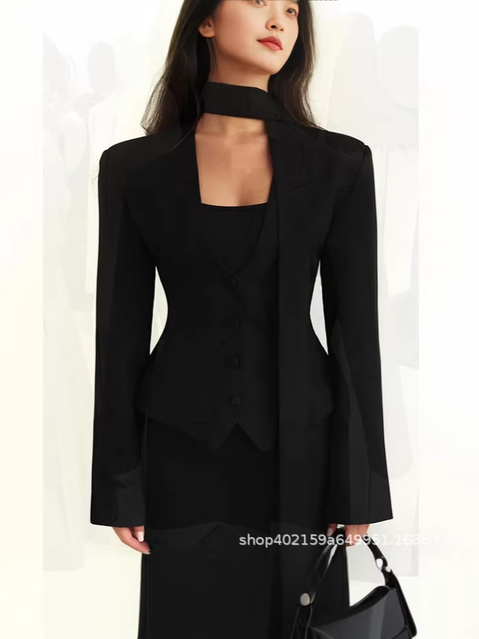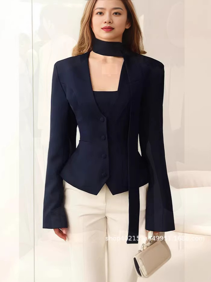 欧美跨境女装2025新款时尚纯色V领围巾饰长袖休闲小西服外套上衣