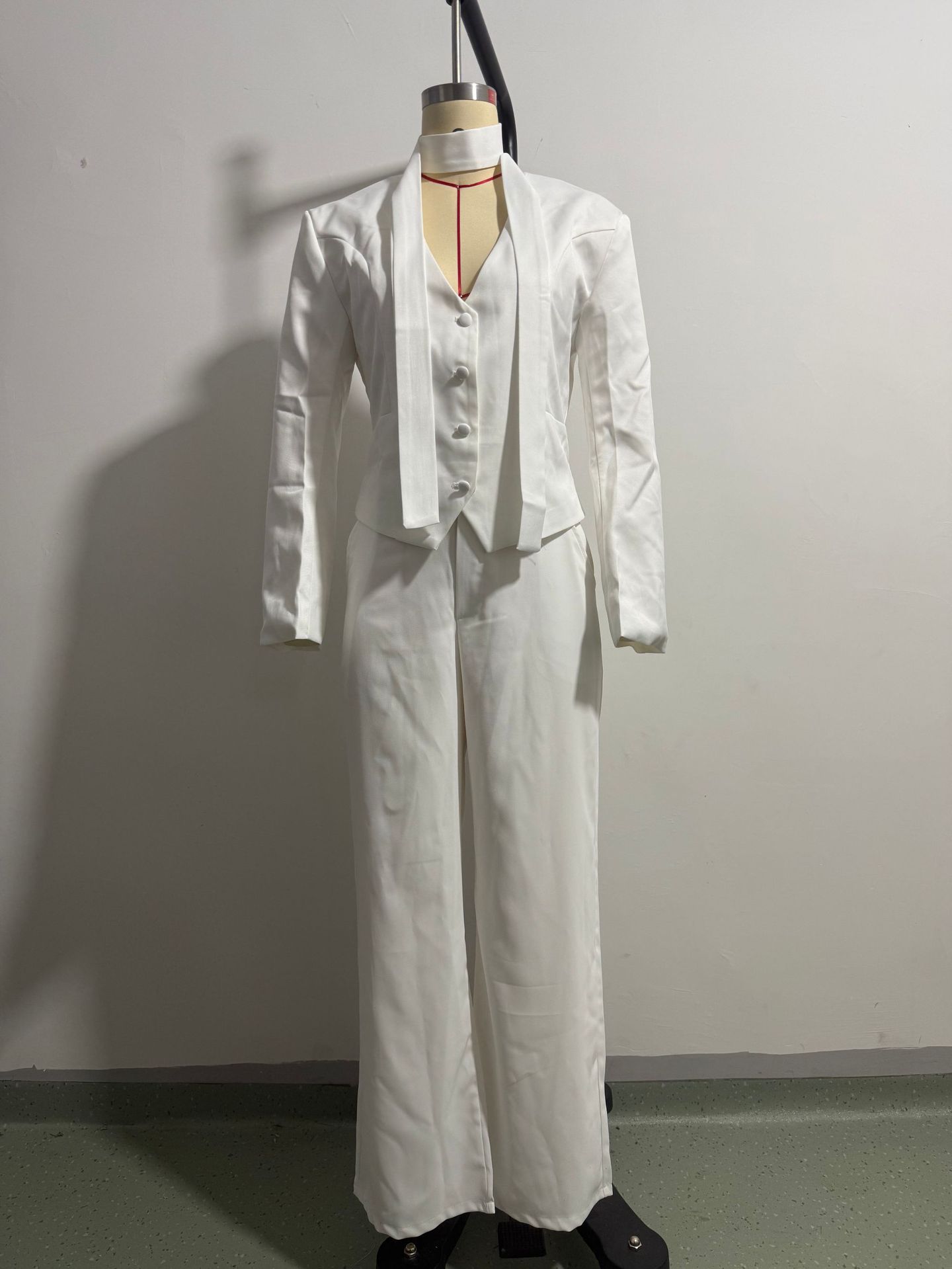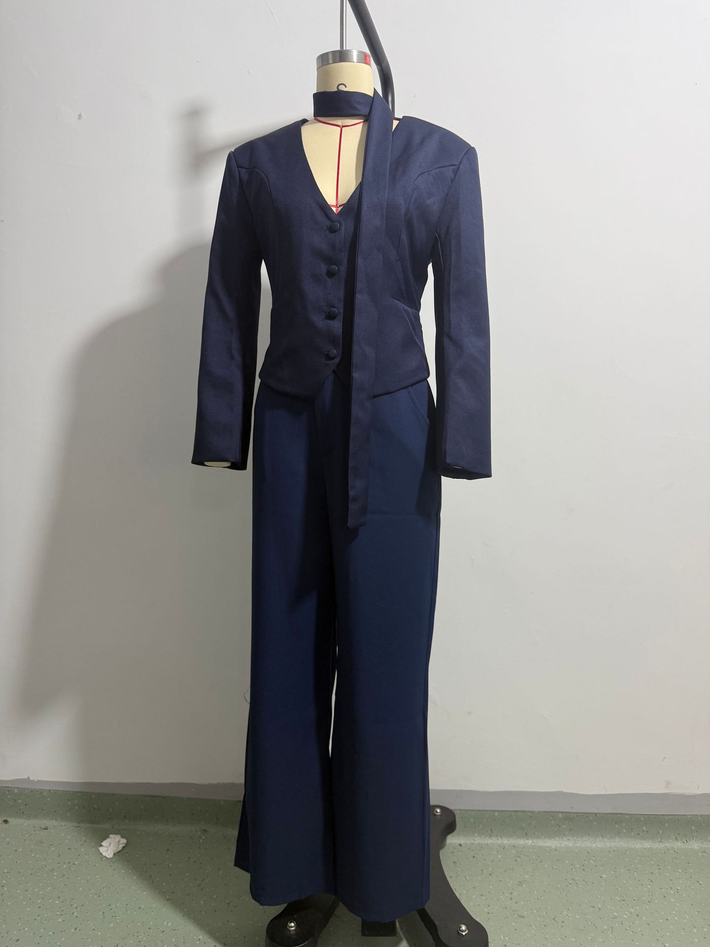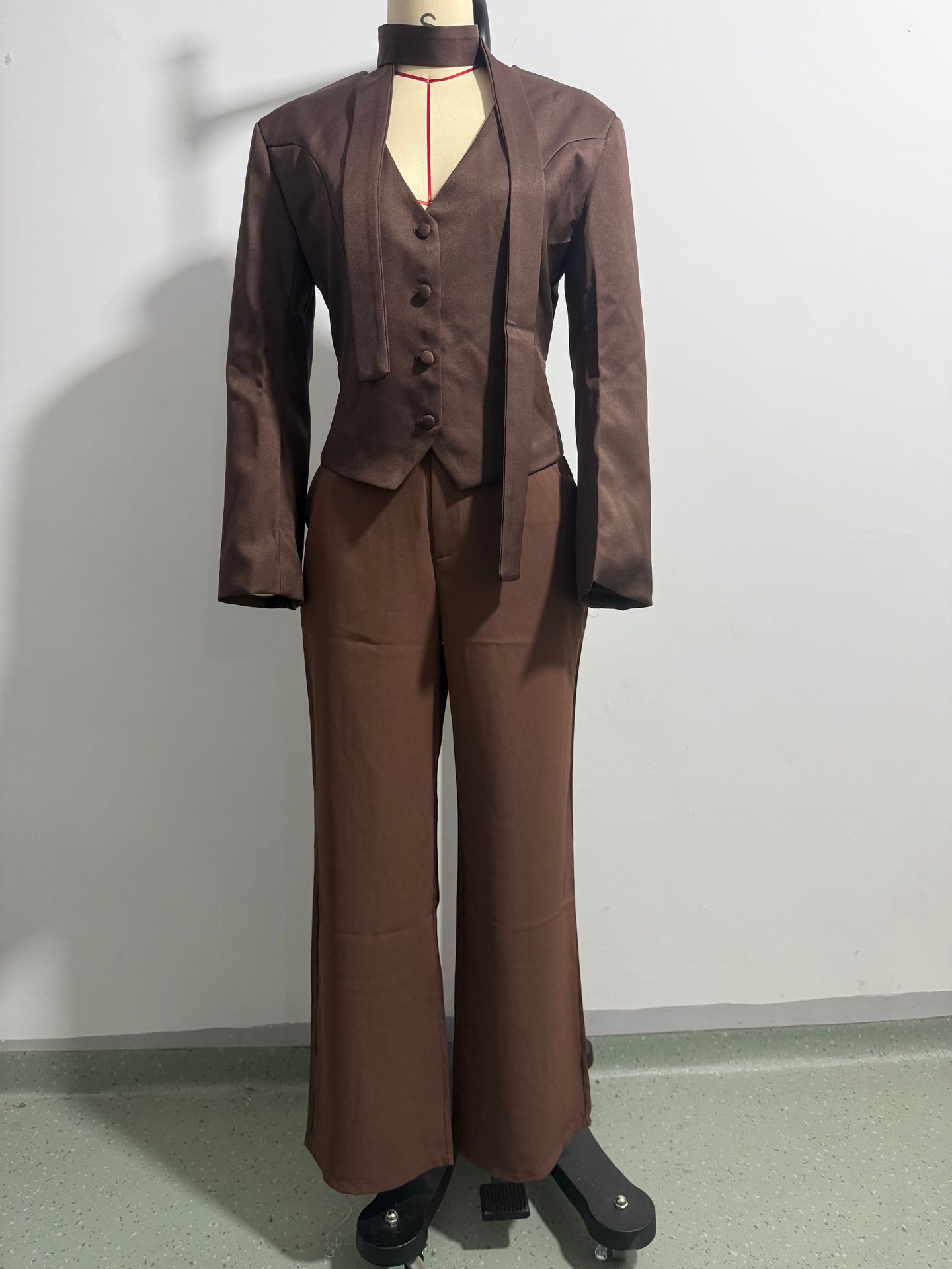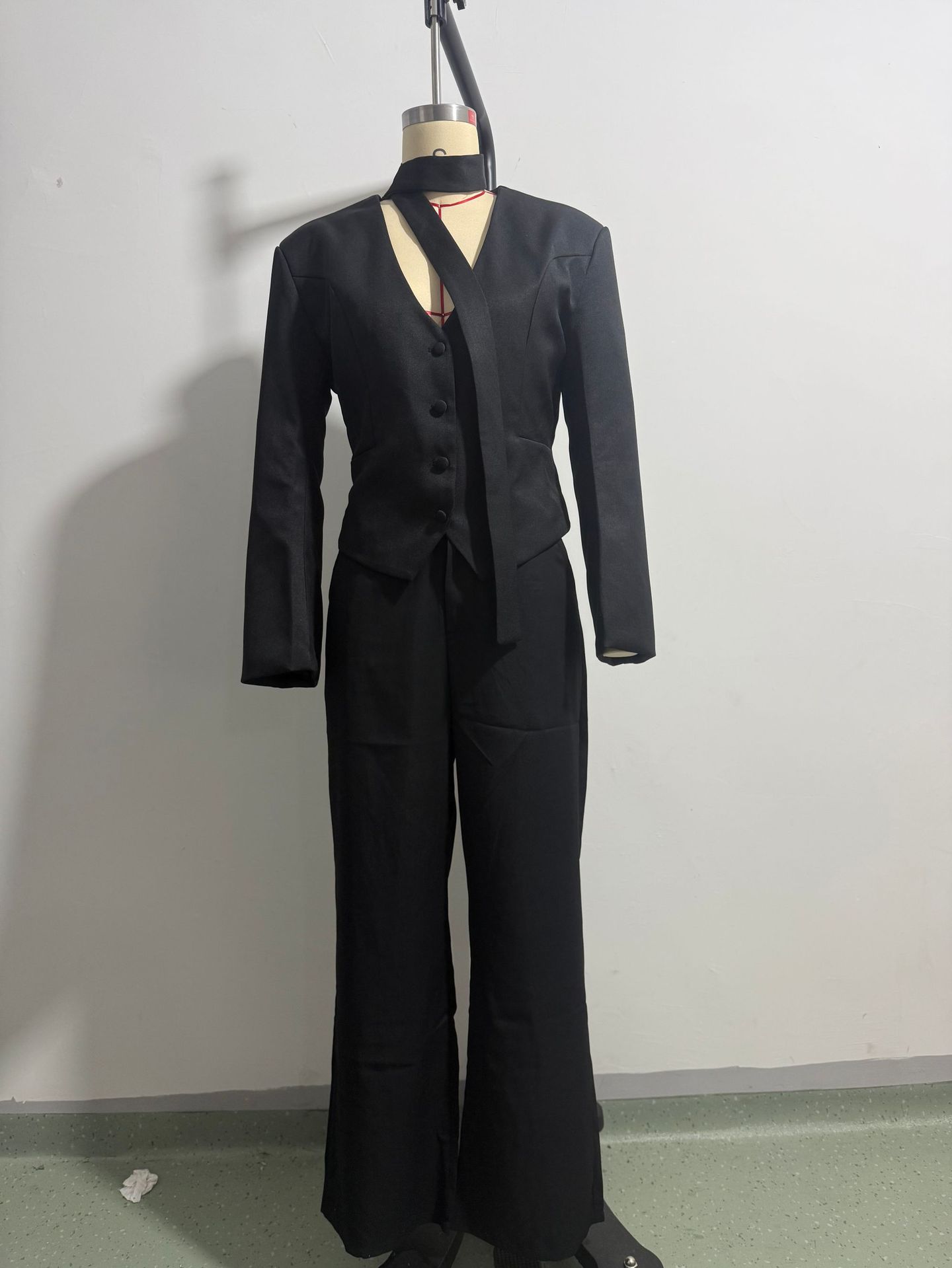 欧美跨境女装2025新款时尚纯色V领围巾饰长袖休闲小西服外套上衣