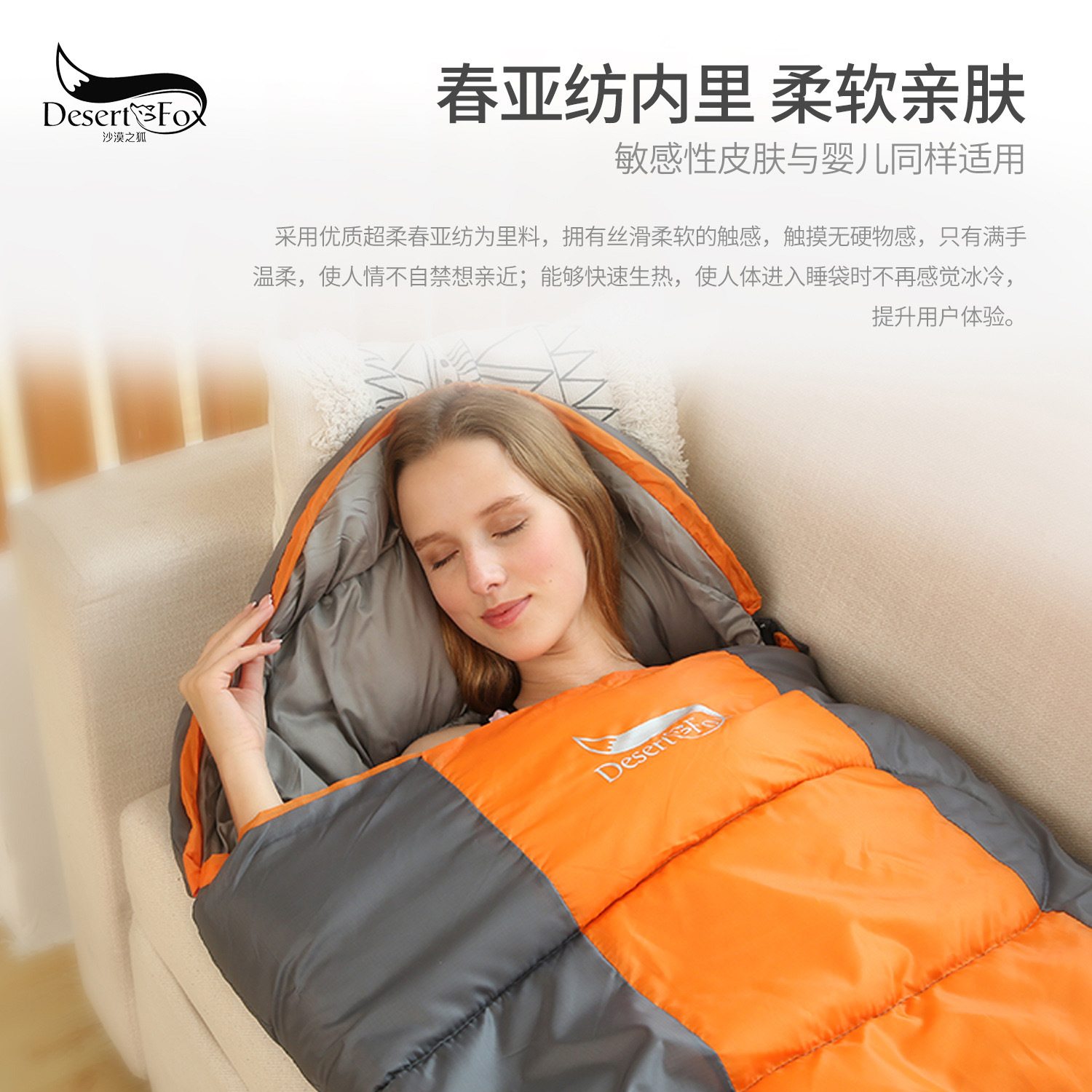 我们沙漠之狐只做高品质的睡袋!我们用的面料都是210T防撕裂格子布,里料更是采用春亚纺,给您的肌肤带来柔软触感!特别要说明的是填充棉,一般的睡袋所用的是喷胶棉,看起来很厚实,但是睡起来却不是很暖和,并且压缩之后摸起来像砖头一样硬,这是因为它的棉里面带有胶的原故。而我们用的棉是纺丝棉,手感非常软,虽然看起来没有喷胶棉那么厚实,但实际上保暖性却要好得多,一吨喷胶棉跟一吨纺丝棉的价格相差了4000元之多,足以证明纺丝棉的高品质,所以大家不要光看厚度,而要去体验它的保暖性哦