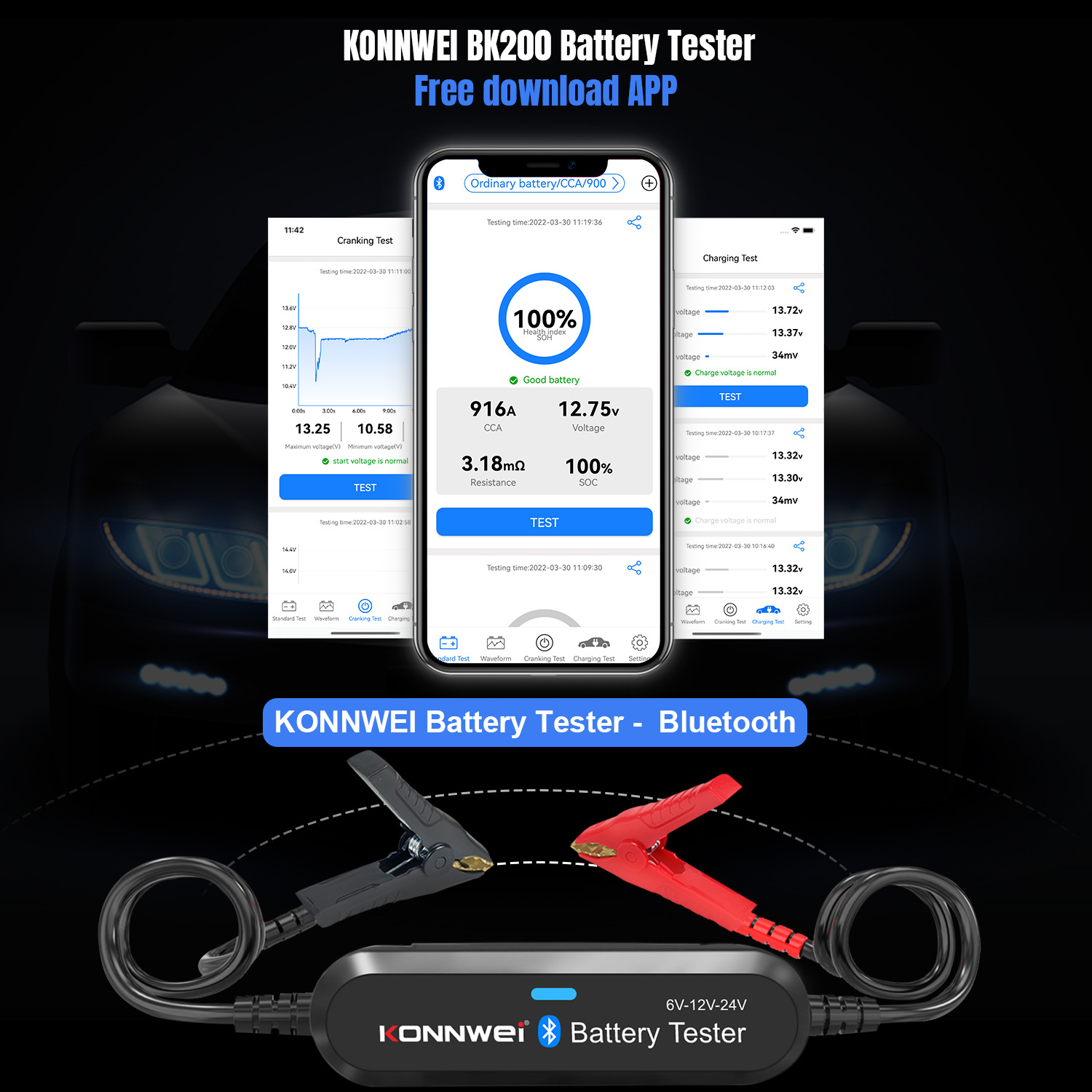 BK200 Bluetooth car battery tester can analyze battery voltage, internal resistance, cold cranking amp, battery health and charge status by APP "Konnwei battery tester”