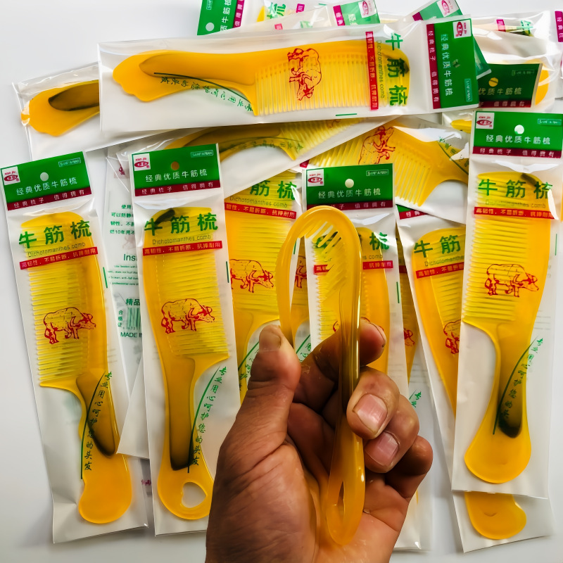 百折不断牛筋梳,折不断,折后无痕迹!款式新颖,这种梳子在市场上卖的很好,跑江湖做展会一天可以卖出1000多把,确实比较吸引人。由于这种梳子在市场上的卖价只有3元,很多人都觉得值。一件1000把,可以混批