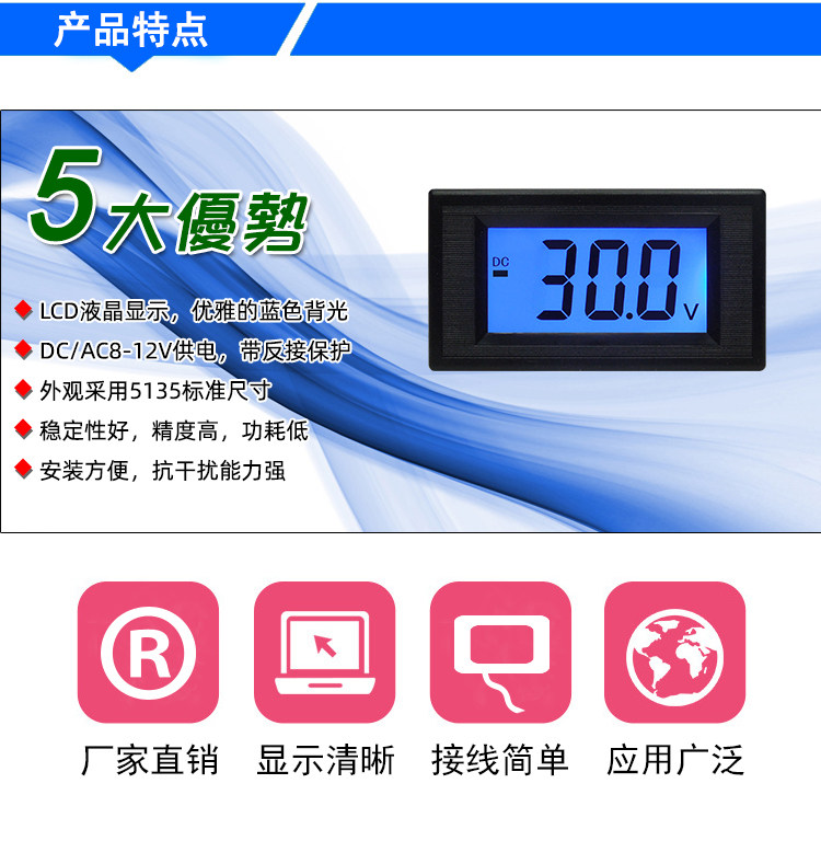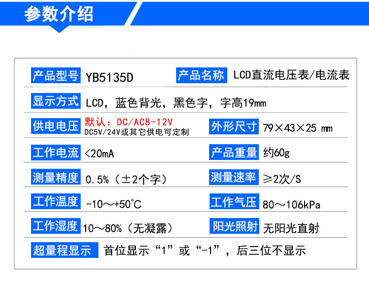 Цифровой вольтметр YB5135D с трехполупрозрачным дисплеем LCD, 200В, DC2A, с функцией измерения положительного и отрицательного тока