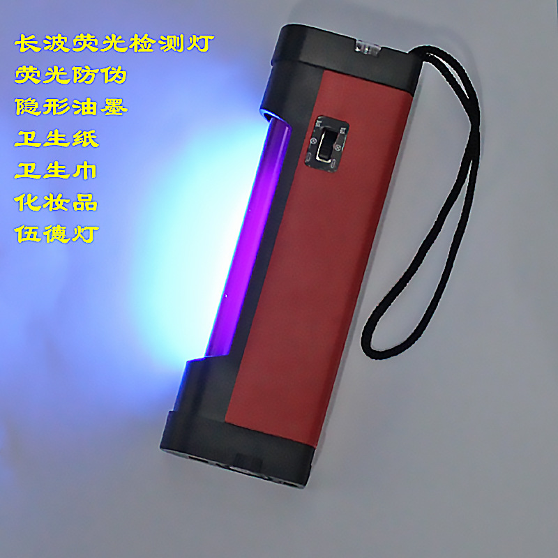 便携式手提紫光荧光防伪灯,装4W短波365nm紫外线灯管,顶端带有白光LED灯,可做照明使用。携带方便,小巧实用。BOT-UVA侧面正常不带滤光片,需要滤光片单加,价格不同。
