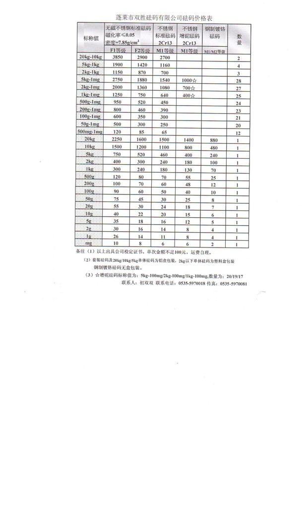 D:主导产品为1Gr18Ni9Ti奥氏体不锈钢材料生产的标准砝码,其等级有F1级、F2级、M1级、M2级。其规格为20kg-1mg的各种元柱型、片型、环型砝码;有套装、单支装;多种选择。