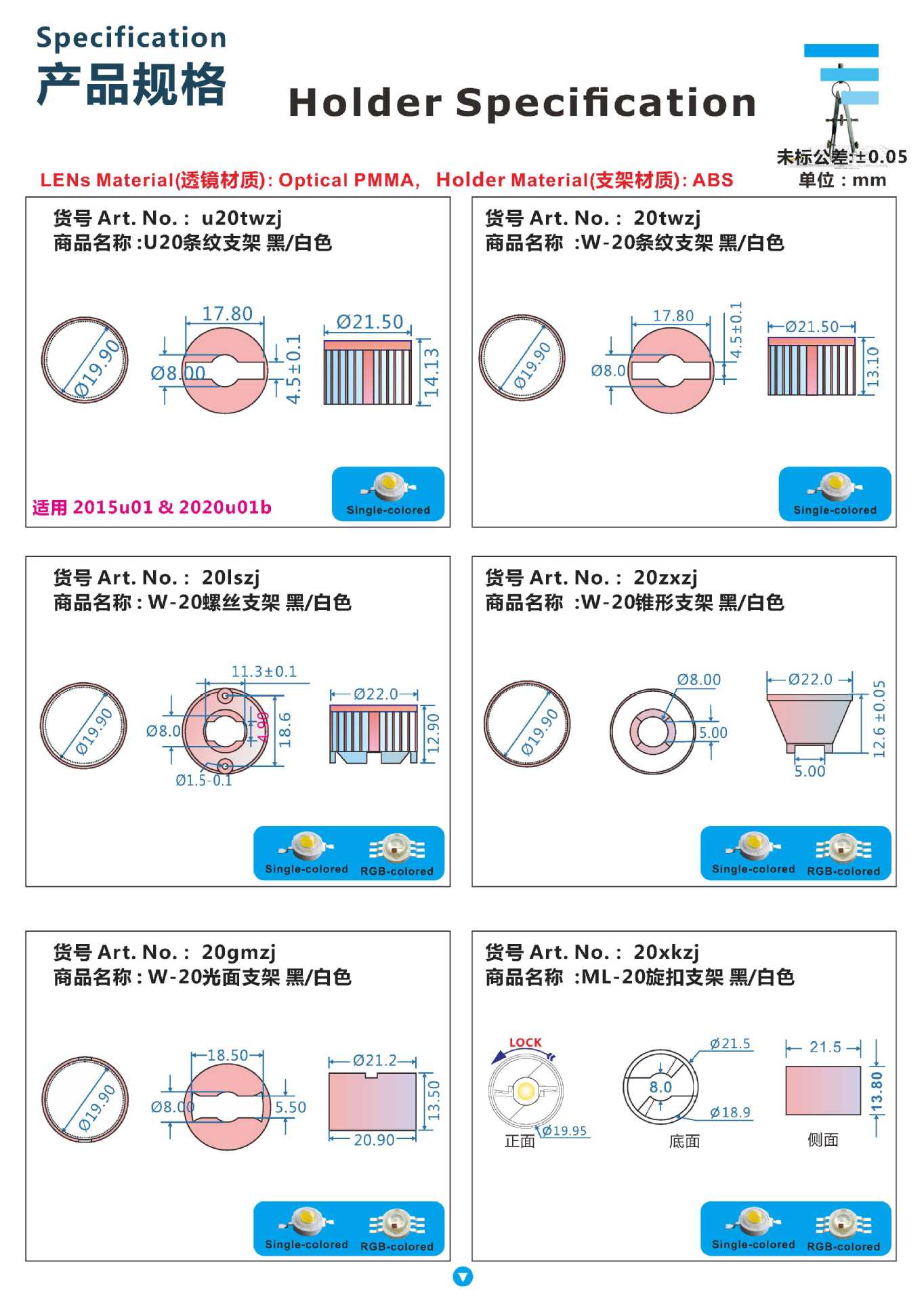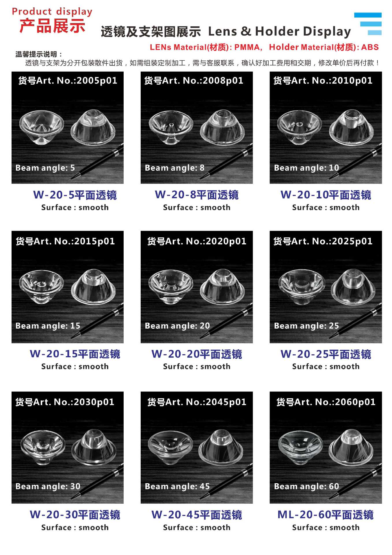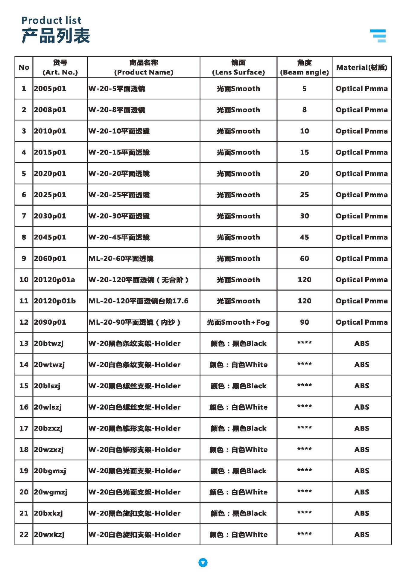 W-20-5 плоский объектив; W-20-8 плоский объектив; W-20-10 плоский объектив; W-20-15 плоский объектив; W-20-20 плоский объектив; W-20-25 плоский объектив; W-20-30 плоский объектив; W-20-45 плоский объектив; ML-20-60 плоский объектив; W-20-120 плоская неступенчатая линза; ML-20-120 плоская ступенчатая линза; ML-20-90 Песочная линза в плоскости; W-20 Кронштейн с черной полосой; W-20 Кронштейн с белой полосой; W-20 черный винтовой кронштейн; W-20 Белый винтовой кронштейн; W-20 Черный конический кронштейн; W-20 Белый конический кронштейн; W-20 Черный глянцевый кронштейн; W-20 Кронштейн с белым блеском; W-20 Зеркало с черным вращением; W-20 Белый кронштейн стяжки