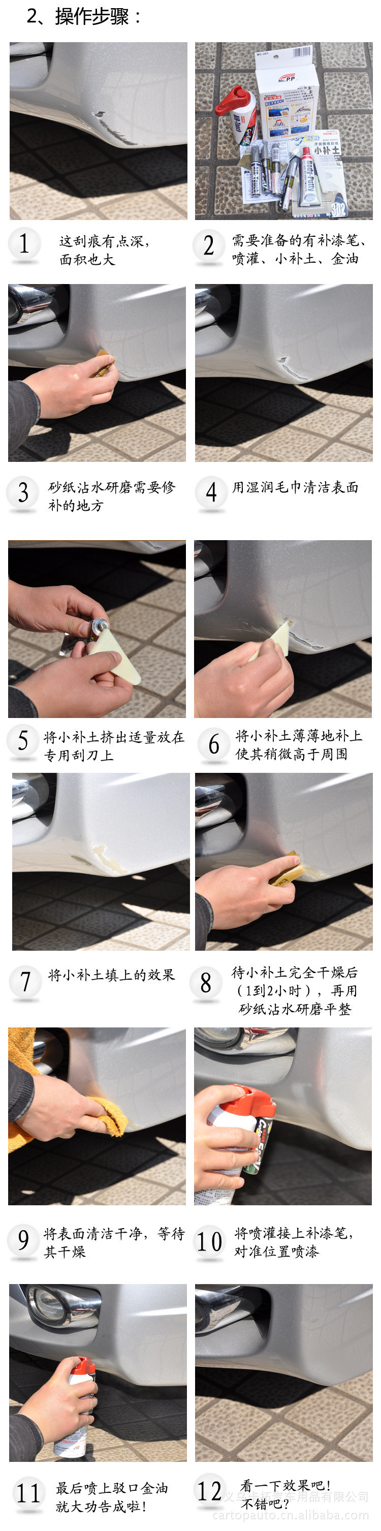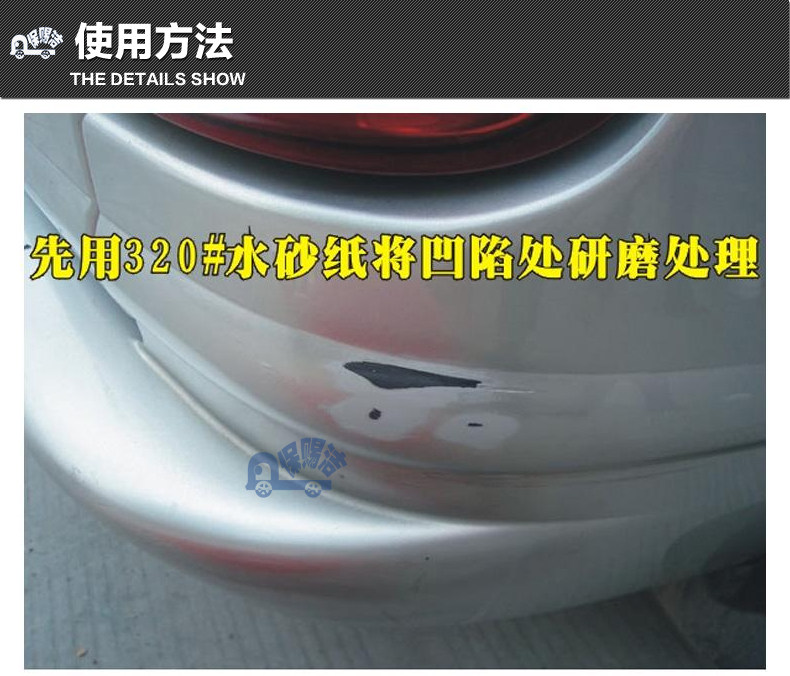 先用所附320#水砂纸沾水将凹陷或刮伤处研磨处理(研磨面积一定要稍大与凹陷部或刮伤处),然后洗净污垢和油脂并晾干。