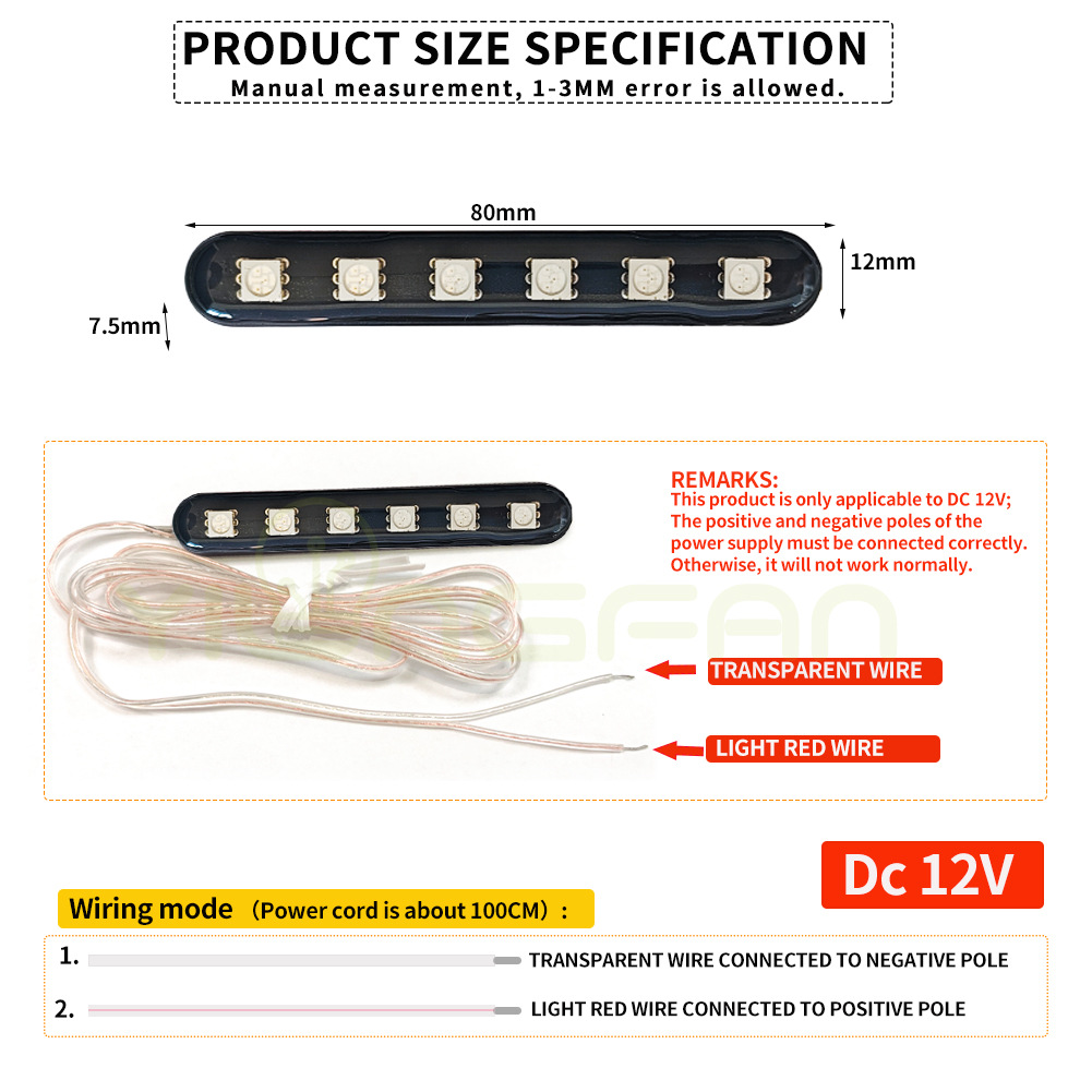 LED数量:6LED 电压:DC12V 电源线长:100CM 产品尺寸:80*12*7.4MM (手工测量有误差)