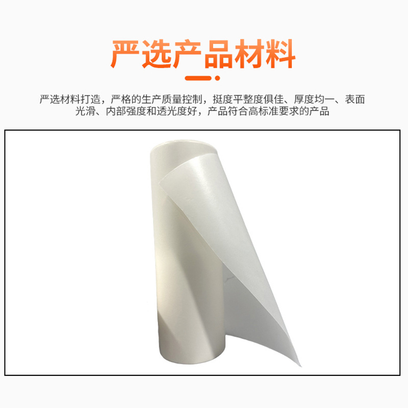 产品特点:离型纸的特点不仅仅体现在其离型力和优质材料上,它还具有环保可持续的特性。由于多数离型纸采用可降解、可回收材料制成,因此使用离型纸可以减少环境负担,符合可持续发展的理念。此外,离型纸的表面平整度高,不易起皱、变形,为作品提供良好的展示效果。另外,离型纸还具备抗油、抗水、抗温度等特性,适用于各种不同环境和工艺要求下的作业。