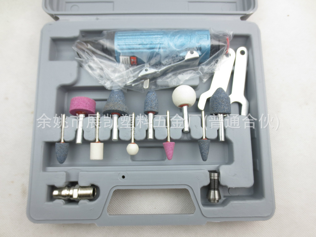 具体配置:气动磨光机1PC,夹头(3mm/6mm)2PC,磨头(3mm/6mm)10PC,扳手2PC,进气接头1PC。