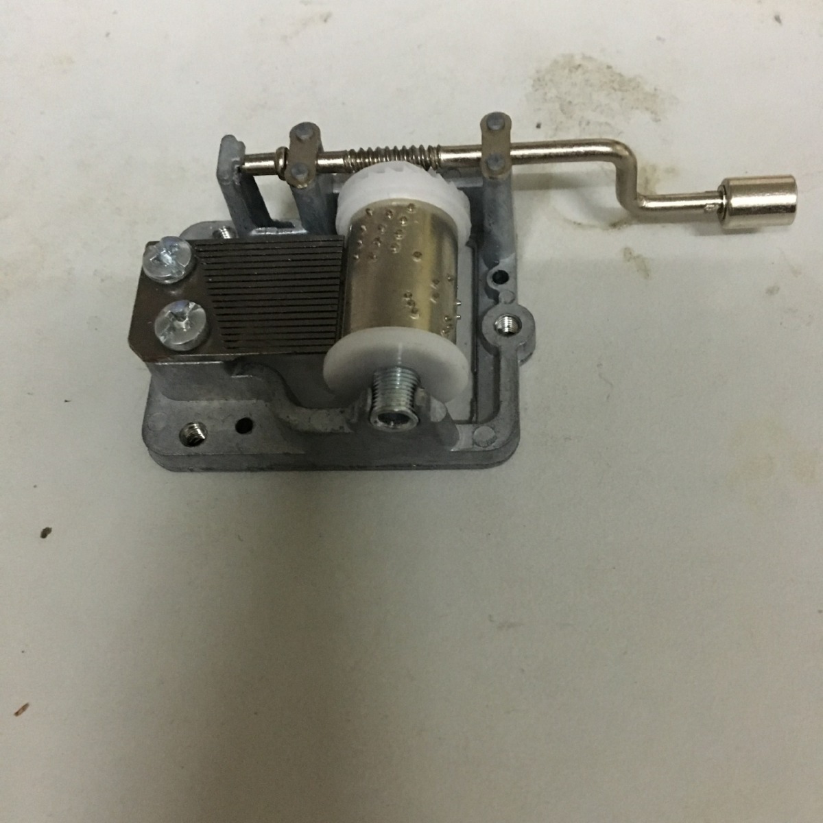 八音盒主要部分由滚筒和簧片两部分组成。原理是发条带动表面有小凸起的滚筒转动,当凸起经过簧片时会拨动簧片(先将其慢慢抬起,然后突然放下)使簧片震动发出声音。八音盒的簧片使发音部分是在一块大的钢板上切割为长短不一的细条做成的。滚筒相当于是乐谱。