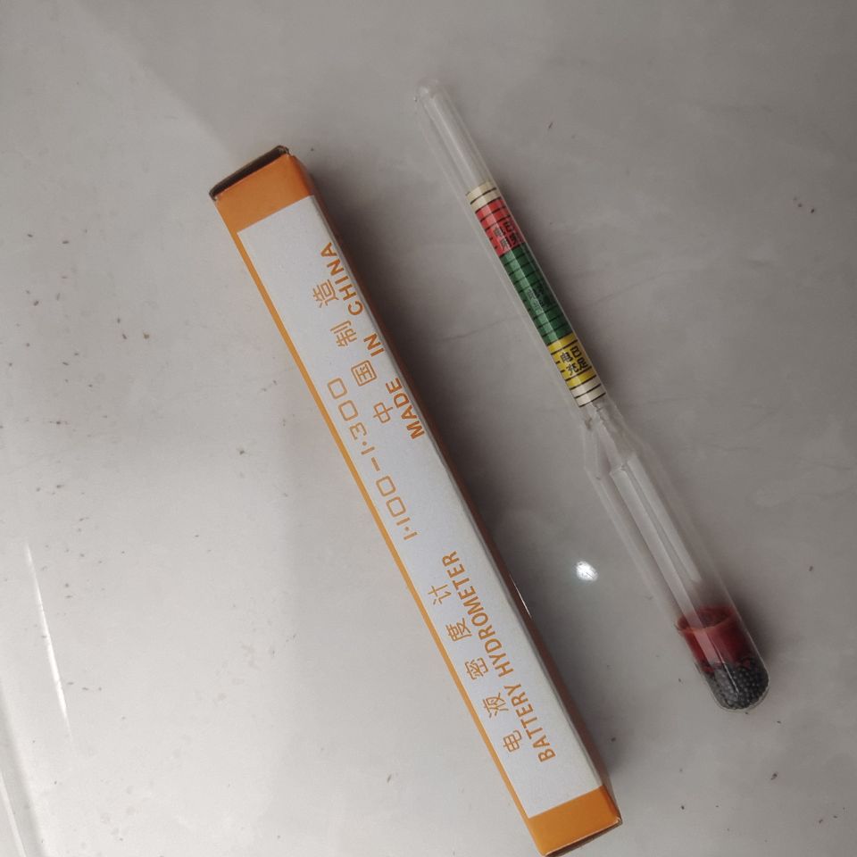 电液密度计(旧称电液比重计)是测量电池内电液密度用的仪表。它是用一根直径为20mm、长约180mm的玻璃圆筒制成,筒的下边装有胶皮嘴,上端装有橡皮球。玻璃圆筒内装有浮子,浮子上刻有1.10~1.30g/mL的密度读数。