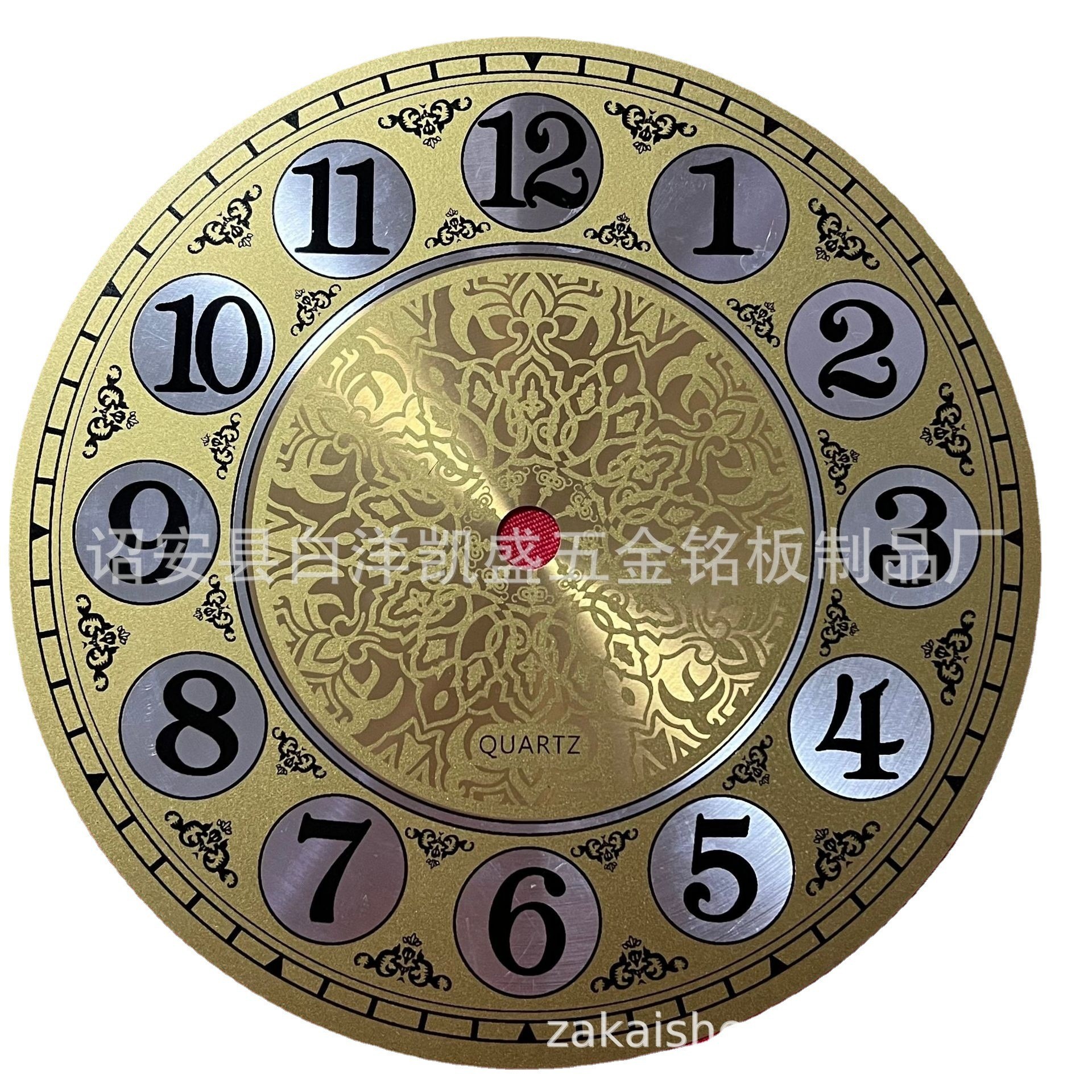 该产品采用磨光CD纹技术使钟面光茫四射,表面采用仿古花纹,中心装饰金点和黑色法条孔标等设计,更显古朴.适合各类仿古钟铁艺钟挂钟,