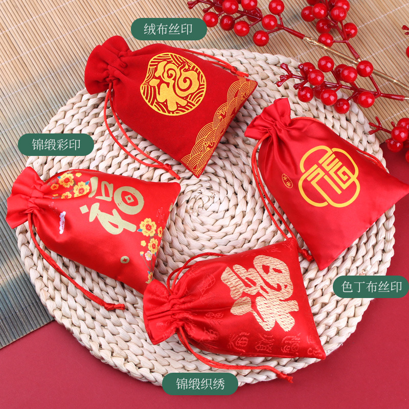Оптовая Китайский Стиль Парча Красный Счастливый Мешок Шнурок Свадьба Праздничные Конфеты Мешок Ювелирных Изделий Упаковка Счастливый Мешок