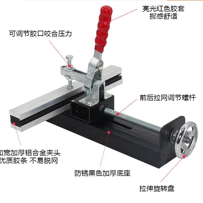 上下夹紧的厚度足够16MM厚;(市场上很多偷工减料,上下夹紧的厚度只有10MM厚),事实证明,16MM厚的胶条夹网纱的时候夹得更加稳、更加牢固,拉网的时候不容易脱网。