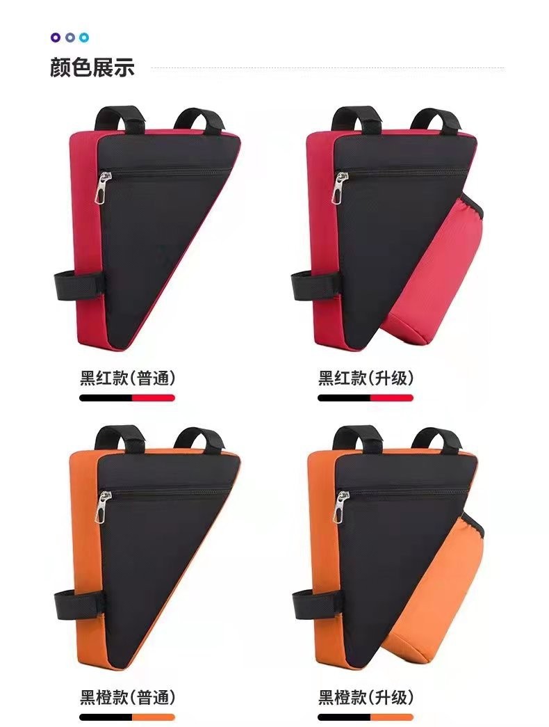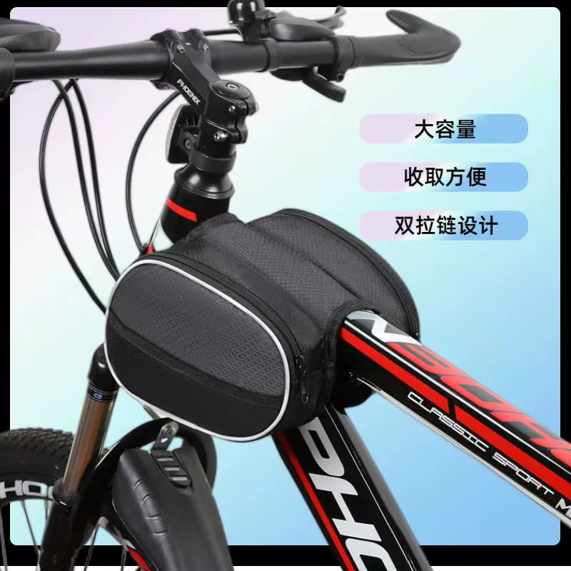 - 特点:装在横梁前部不影响骑行,硬壳设计不易变形,贵重物品放在眼前不易被偷窃,包包侧面每个小袋都有两层 一边一个大融积袋子 方便放手机 钱包 工具 MP3等小物品 外部的半透明网袋可以放薄一点的东西 透明网格清晰可见 两个带子一个固定在前面的上管一个固定在上梁上都是魔术粘扣 下车的时候可以取走