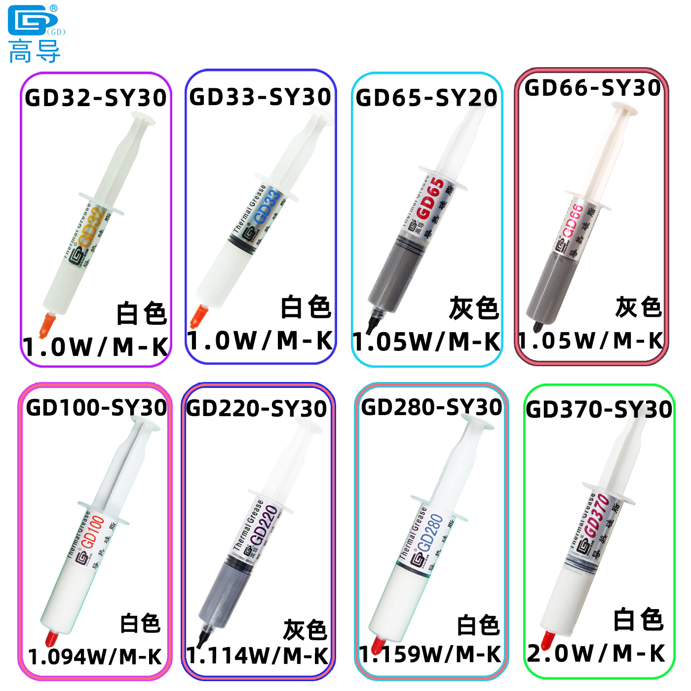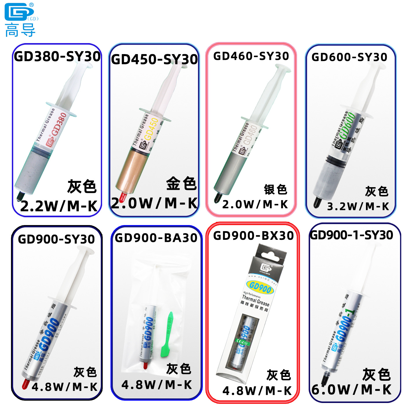 GD32-SY30 Белый 1,0 Вт/М-К Вес нетто 30 г в игольной трубке; GD33-SY30 Белый 1,0 Вт/М-К Вес нетто 30 г в игольной трубке; GD65-SY20 серый 1,05 Вт/М-К вес нетто 30 г в игольной трубке; GD66-SY30 серый 1,05 Вт/М-К вес нетто 30 г в игольной трубке; GD100-SY30 Белый 1,094 Вт/М-К Вес нетто 30 г в игольной трубке; GD220-SY30 Серый 1,114 Вт/М-К Вес нетто 30 г в игольной трубке; GD280-SY30 Белый 1,159 Вт/М-К Вес нетто 30 г в игольной трубке; GD370-SY30 Белый 2,0 Вт/М-К Вес нетто 30 г в игольной трубке; GD380-SY30 Серый 2,2 Вт/М-К Вес нетто 30 г в игольной трубке; GD450-SY30 золото 2,0 Вт/М-К вес нетто 30 г в игольной трубке; GD460-SY30 серебристый 2,0 Вт/М-К вес нетто 30 г в игольной трубке; GD600-SY30 серый 3,2 Вт/М-К вес нетто 30 г в игольной трубке; GD900-SY30 Серый 4,8 Вт/М-К Вес нетто 30 г в игольной трубке; GD900-BA30 Серый 4,8 Вт/М-К Вес нетто 30 г в шприце с застежкой-молнией; GD900-BX30 серый 4,8 Вт/М-К вес нетто 30 г в цветной коробке и игольной трубке; GD900-1-SY30 Серый 6,0 Вт/М-К Вес нетто 30 г в игольной трубке; GD900-1-BA30 Серый 6,0 Вт/М-К Вес нетто 30 г в шприце с застежкой-молнией; GD007-SY30 Серый 6,8 Вт/М-К Вес нетто 30 г в игольной трубке; GD007-BA30 Серый 6,8 Вт/М-К Вес нетто 30 г в шприце с застежкой-молнией; GD-2-SY30 Серый 7,5 Вт/М-К Вес нетто 30 г в игольной трубке; GD-2-BA30 Серый 7,5 Вт/М-К Вес нетто 30 г в шприце в пакете с застежкой-молнией; GD-2-BX30 Серый 7,5 Вт/М-К Вес нетто 30 г в цветной коробке и игольной трубке; GD-3-SY30 Серый 7,5 Вт/М-К Вес нетто 30 г в игольной трубке; GD-3-BA30 Серый 7,5 Вт/M-K Вес нетто 30 г в шприце в пакете с застежкой-молнией; GD-3-BX30 серая игольная трубка 7,5 Вт/M-K, вес нетто 30 г, в блистерной упаковке и цветной коробке