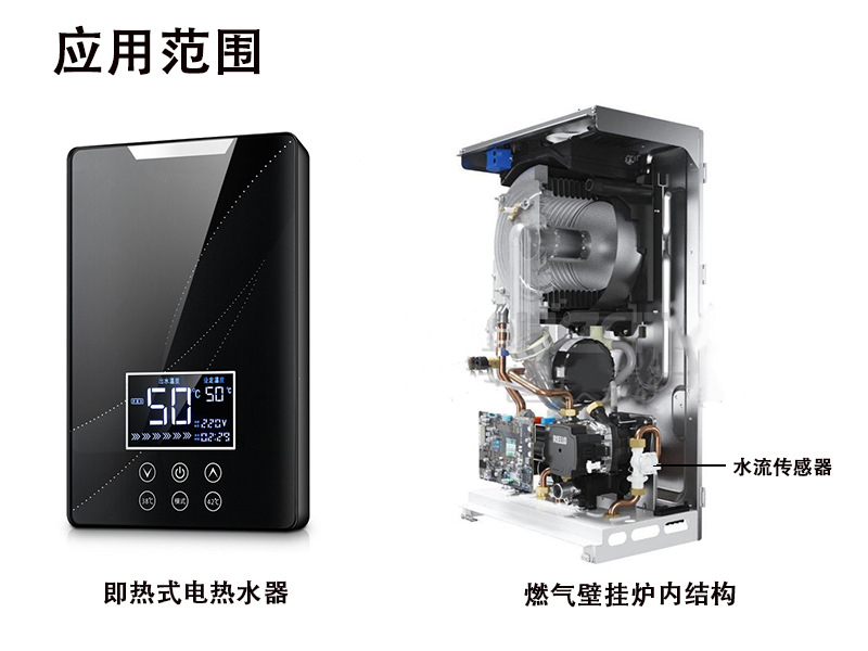 - 产品应用于:即热式电热水器、燃气壁挂炉、洗手宝、小感宝、仪器仪表等需要计量的设备。