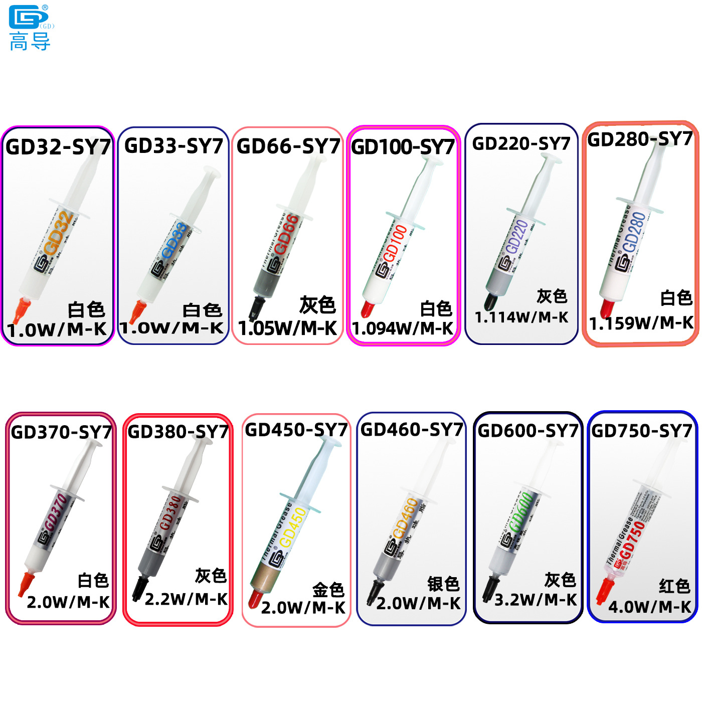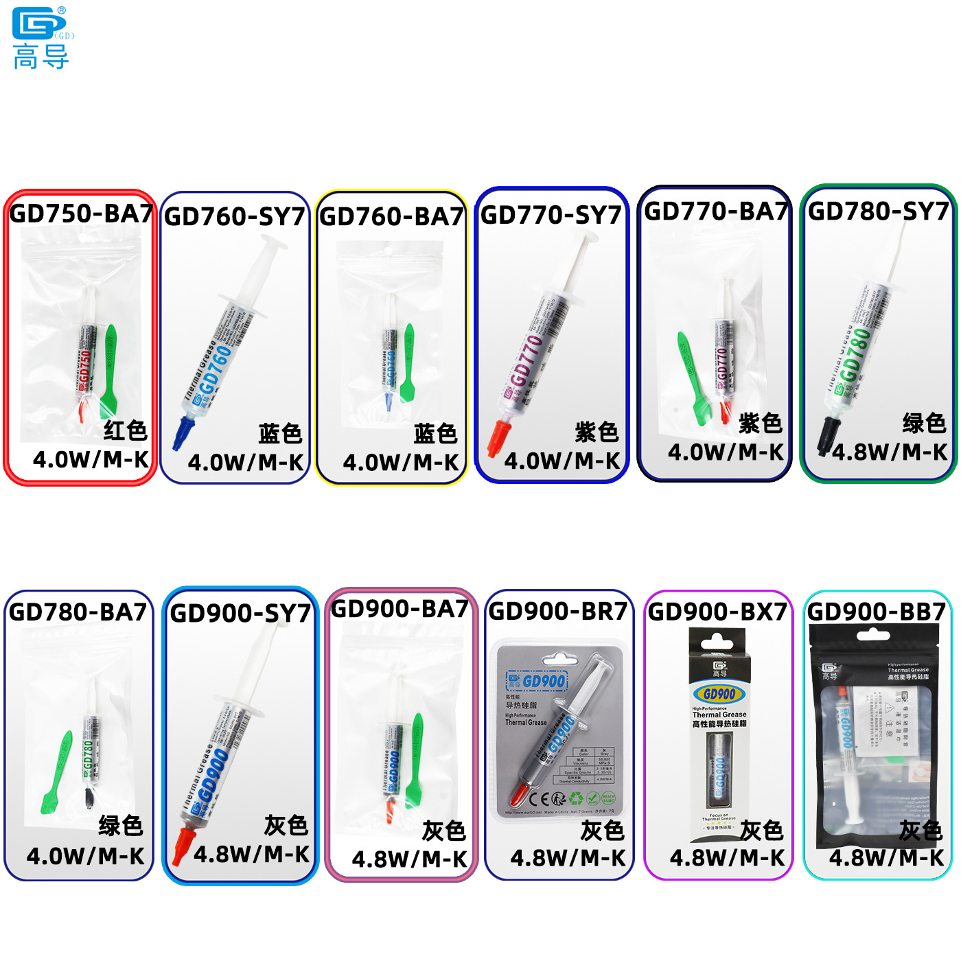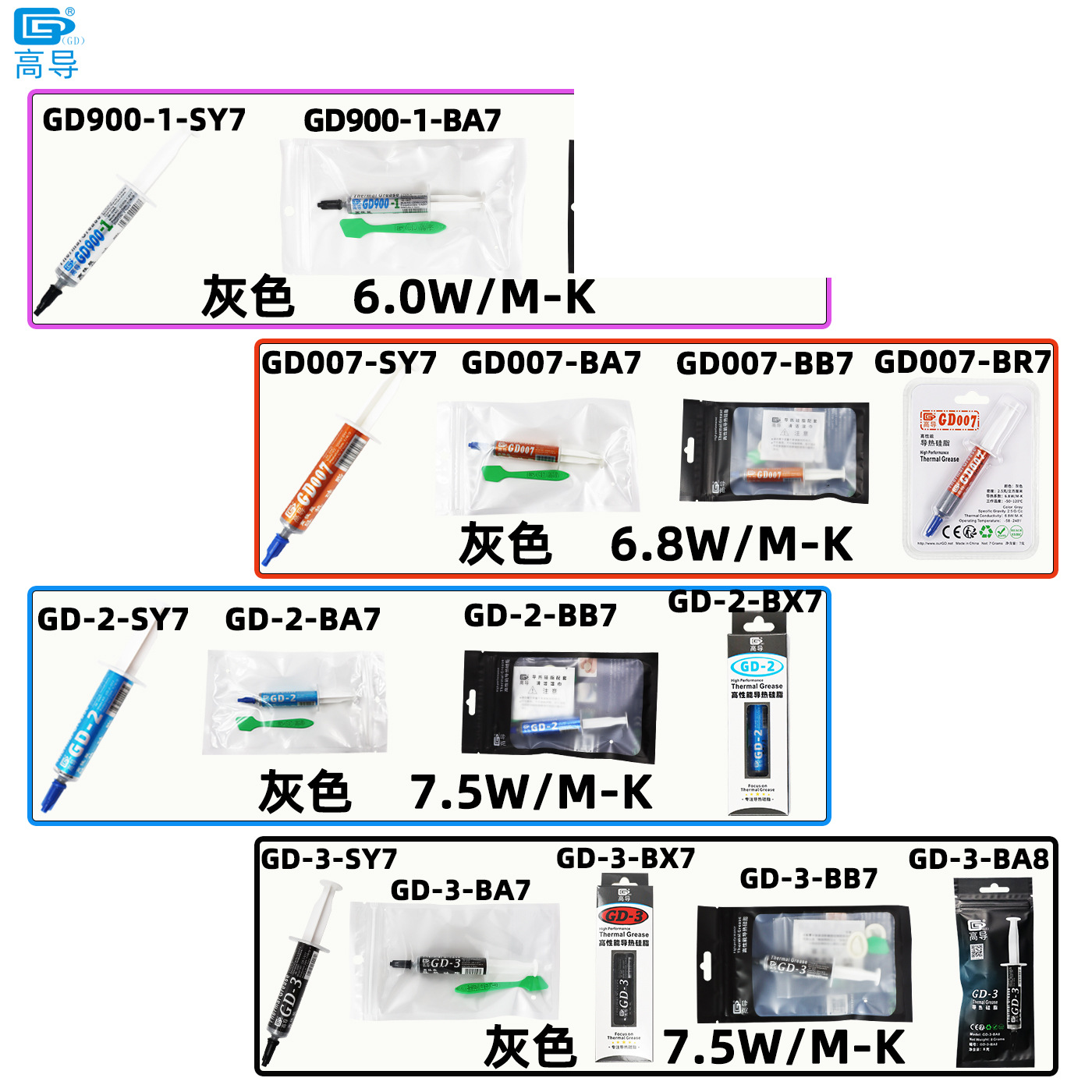 GD32-SY7 Белый 1,0 Вт/М-К Вес нетто 7 г в игольной трубке; GD33-SY7 Белый 1,0 Вт/М-К Вес нетто 7 г в игольной трубке; GD66-SY7 Серый 1,05 Вт/М-К Вес нетто 7 г в игольной трубке; GD100-SY7 Белый 1,094 Вт/М-К Вес нетто 7 г в игольной трубке; GD220-SY7 Серый 1,114 Вт/М-К Вес нетто 7 г в игольной трубке; GD280-SY7 Белый 1,159 Вт/М-К Вес нетто 7 г в игольной трубке; GD370-SY7 Белый 2,0 Вт/М-К Вес нетто 7 г в игольной трубке; GD380-SY7 Серый 2,2 Вт/М-К Вес нетто 7 г в игольной трубке; GD450-SY7 золото 2,0 Вт/М-К вес нетто 7 г в игольной трубке; GD460-SY7 Серебристый 2,0 Вт/М-К Вес нетто 7 г в игольной трубке; GD600-SY7 Серый 3,2 Вт/М-К Вес нетто 7 г в игольной трубке; GD750-SY7 красный 4,0 Вт/М-К вес нетто 7 г в игольной трубке; GD750-BA7 красный 4,0 Вт/M-K вес нетто 7 г в шприце в пакете с застежкой-молнией; GD760-SY7 синий 4,0 Вт/M-K вес нетто 7 г в игольной трубке; GD760-BA7 синий 4,0 Вт/M-K вес нетто 7 г в шприце в пакете с застежкой-молнией; GD770-SY7 Фиолетовый 4,0 Вт/M-K Вес нетто 7 г в игольной трубке; GD770-BA7 Фиолетовый 4,0 Вт/М-К Вес нетто 7 г в шприце с застежкой-молнией; GD780-SY7 Зеленый 4,0 Вт/М-К Вес нетто 7 г в игольной трубке; GD780-BA7 Зеленый 4,0 Вт/М-К Вес нетто 7 г в шприце с застежкой-молнией; GD900-SY7 Серый 4,8 Вт/М-К Вес нетто 7 г в игольной трубке; GD900-BA7 Серый 4,8 Вт/М-К Вес нетто 7 г в шприце в пакете с застежкой-молнией; GD900-BR7 Серый 4,8 Вт/М-К Вес нетто 7 г в блистерной игольной трубке; GD900-BX7 серая игольная трубка мощностью 4,8 Вт/М-К, вес нетто 7 г, в блистерной упаковке и цветной коробке; GD900-BB7 Серый 4,8 Вт/M-K Вес нетто 7 г Игольная трубка с пакетом на молнии; GD900-1-SY7 Серый 6,0 Вт/М-К Вес нетто 7 г в игольной трубке; GD900-1-BA7 Серый 6,0 Вт/М-К Вес нетто 7 г в шприце в пакете с застежкой-молнией; GD900-1-BB7 Серый 6,0 Вт/М-К Вес нетто 7 г Игольная трубка с пакетом на молнии; GD007-SY7 Серый 6,8 Вт/М-К Вес нетто 7 г в игольной трубке; GD007-BA7 Серый 6,8 Вт/М-К Вес нетто 7 г в шприце в пакете с застежкой-молнией; GD007-BR7 Серый 6,8 Вт/М-К Вес нетто 7 г в блистерной игольной трубке; GD007-BB7 Серый 6,8 Вт/М-К Вес нетто 7 г шприца в пакете с застежкой-молнией; GD-2-SY7 Серый 7,5 Вт/М-К Вес нетто 7 г в игольной трубке; GD-2-BA7 Серый 7,5 Вт/М-К Вес нетто 7 г в шприце в пакете с застежкой-молнией; GD-2-BX7 Серый 7,5 Вт/М-К Вес нетто Игольная трубка 7 г с блистерной коробкой и цветной коробкой; GD-2-BB7 Серый 7,5 Вт/М-К Вес нетто 7 г Мешок с игольной трубкой и застежкой-молнией; GD-3-SY7 Серый 7,5 Вт/М-К Вес нетто 7 грамм в игольной трубке; GD-3-BA7 Серый 7,5 Вт/M-K Вес нетто 7 г, игольная трубка, сумка с застежкой-молнией; GD-3-BB7 Серый 7,5 Вт/M-K Вес нетто 7 г, игольная трубка, сумка с застежкой-молнией; GD-3-BX7 Серый 7,5 Вт/M-K Вес нетто Игольная трубка 7 г с блистерной коробкой и цветной коробкой; GD-3-BA8 серый 7,5 Вт/М-К, вес нетто 8 г, шприц с композитным пакетом
