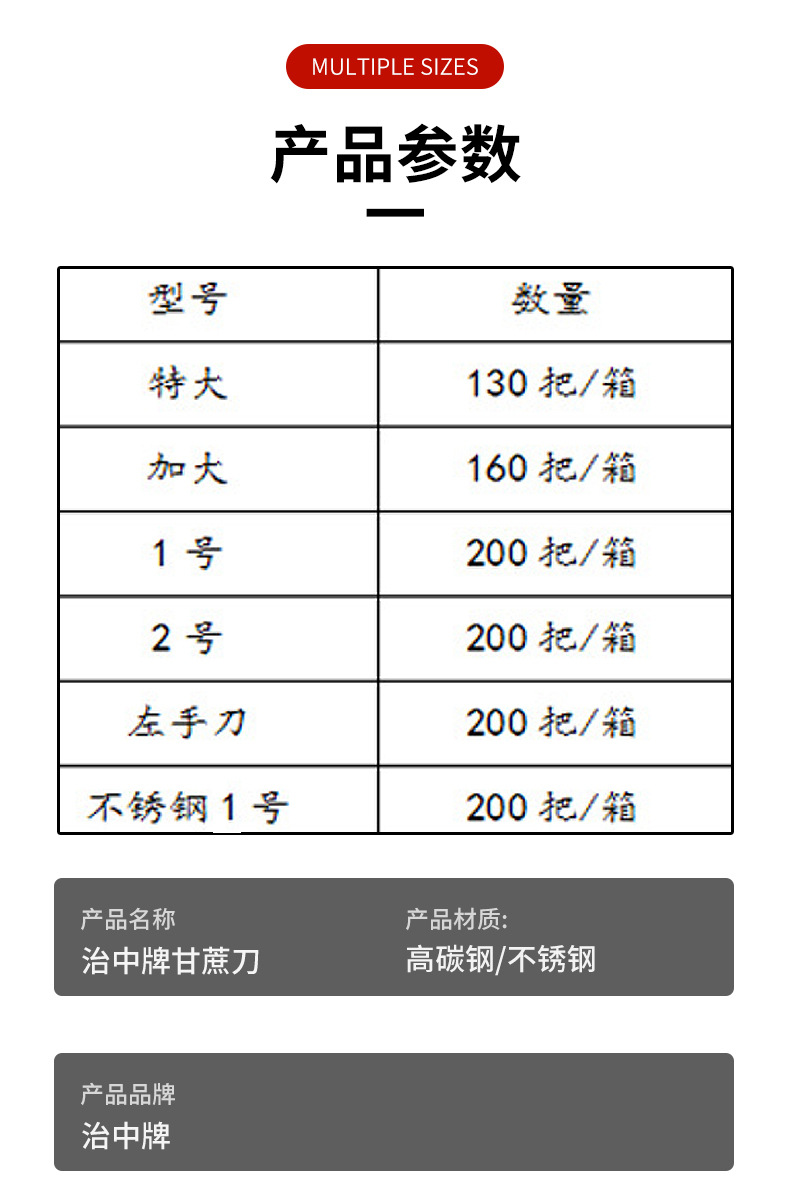 Нож для сахарного тростника Zhizhong, увеличенного размера (№1 «Король сахарного тростника»); Нож для сахарного тростника Zhizhong, увеличенного размера (№2 "Король сахарного тростника"); Нож для сахарного тростника Zhizhong, бренд №1; Нож для сахарного тростника Zhizhong, модель №2; Нож для сахарного тростника Zhizhong для левой руки; Нож для сахарного тростника Zhizhong №1 из нержавеющей стали; Нож для сахарного тростника Zhizhong №2 из нержавеющей стали