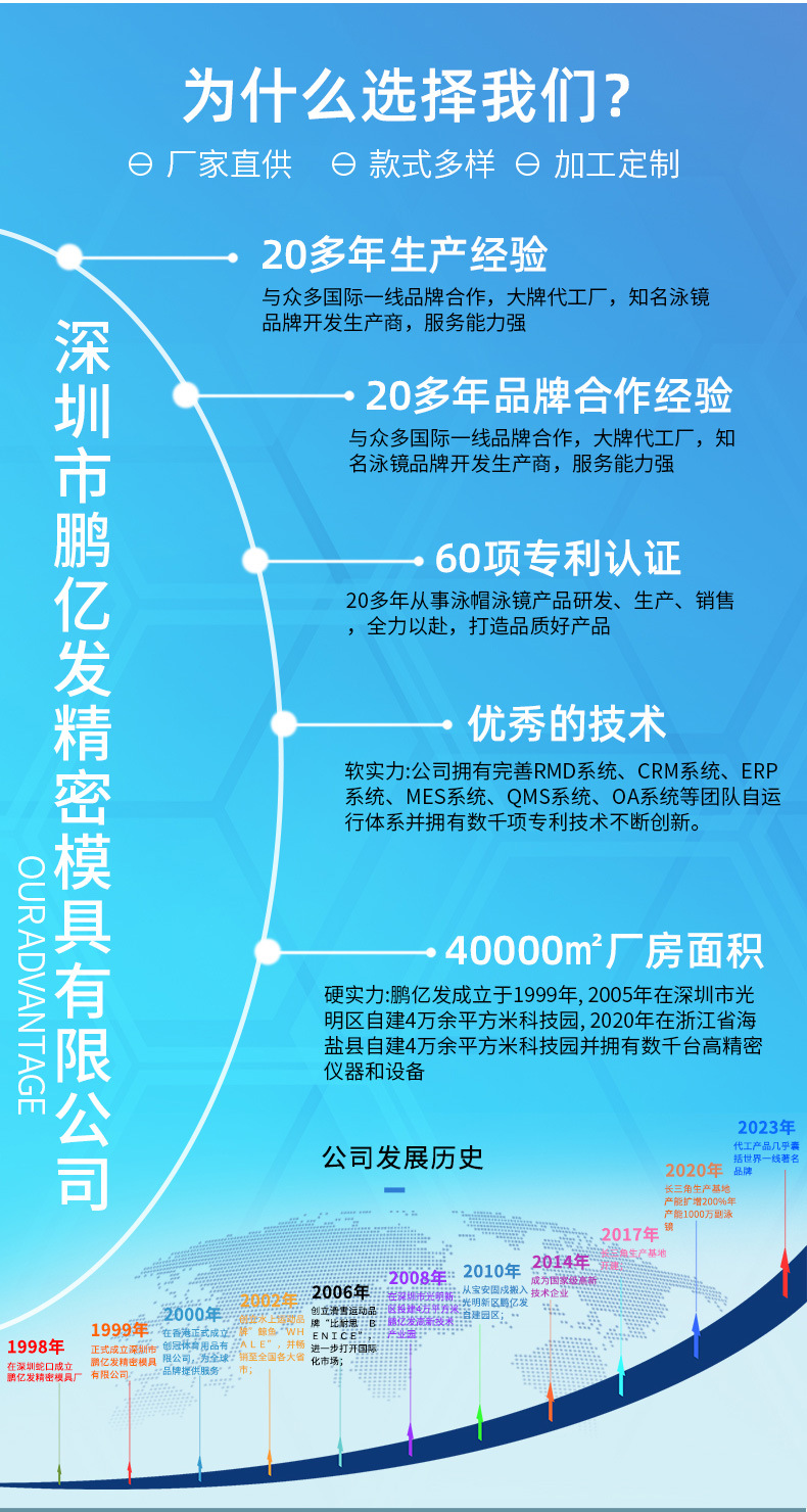 二、鹏亿发是游泳、潜水、滑雪行业内拥有22年集研发、生产、销售、服务于一体的高新技术企业;