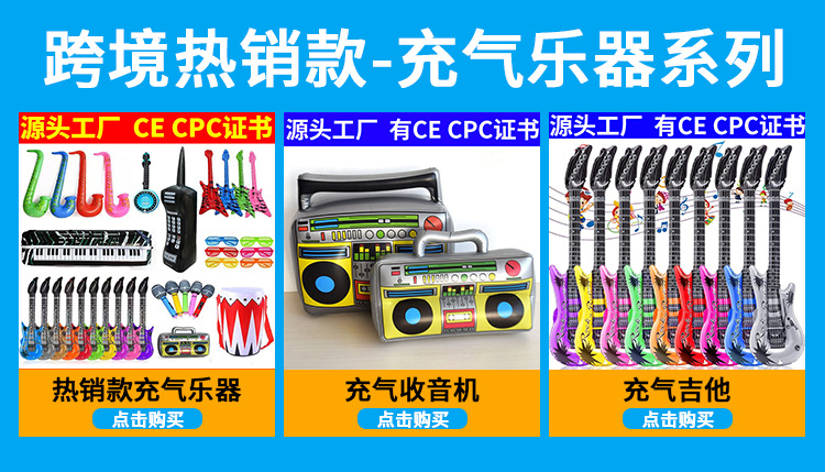 本厂所生产的把有PVC充气乐器产品都是采用PVC材料加工,可以通过欧美的检测。机器印刷,图案精美,款式齐全,支持订制。