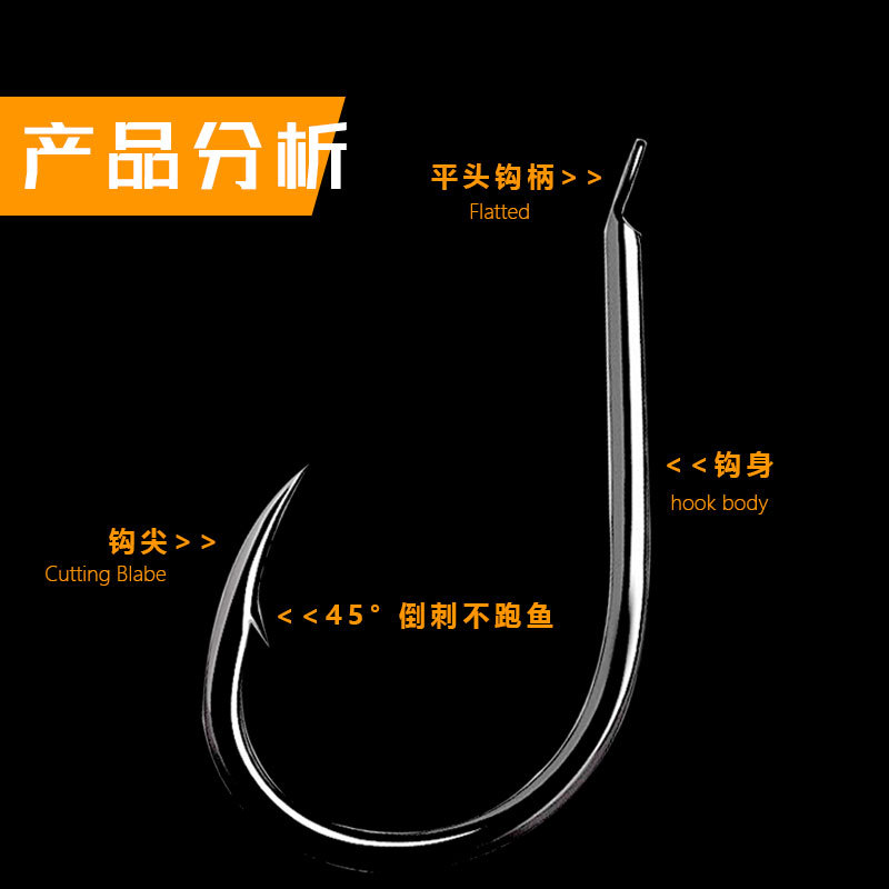 袖:此钩型无倒刺。钩尖锋利,钩柄长,钩条细钩身轻,适用于吸入取食的小型鱼种,快钓快取,多用于钓白鲫、小白条等。