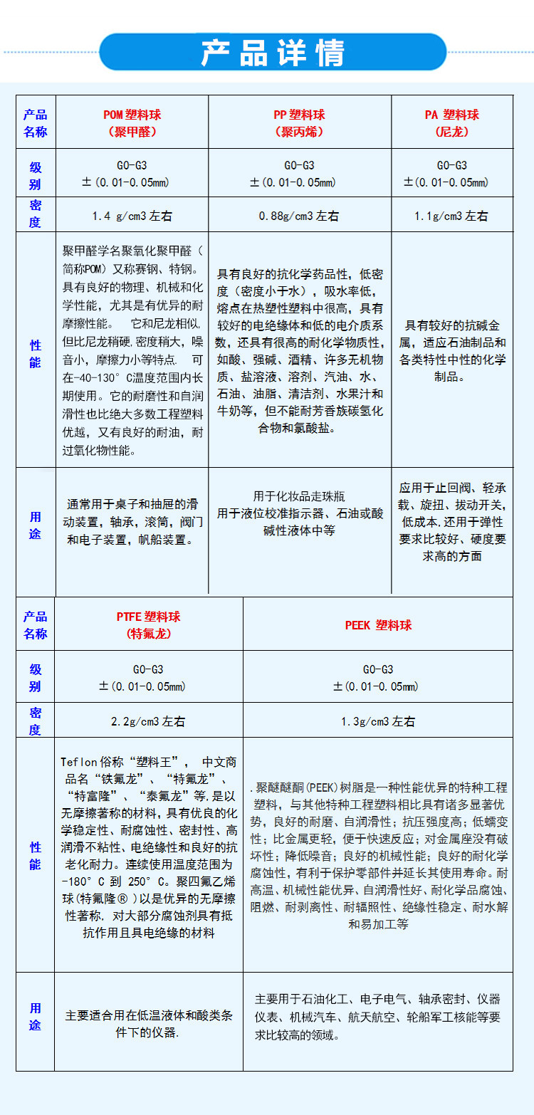 Косметические роликовые шарики, медицинское оборудование, пищевые машины, индикаторы калибровки уровня жидкости и твердые пластиковые шарики, специально предназначенные для нефти или кислотных/щелочных жидкостей.