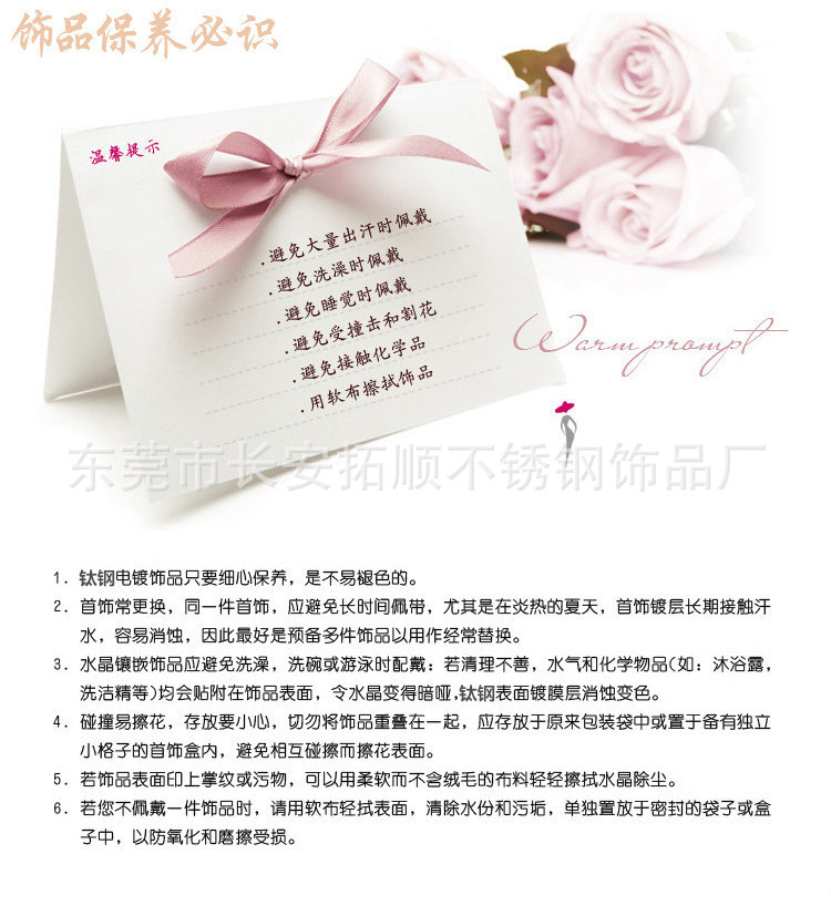 广东省东莞市拓顺不锈钢饰品有限公司成立于2008年,位于东莞市长安镇。本公司是一家集设计、生产、销售为一体的综合型企业。旗下拥有自动车床和CNC数控、精雕、铸造、磨床 等先进设备,以及高素质的设计和管理人才。专业生产不锈钢饰品(耳环耳钉、戒指、手镯手链、项链吊坠、眉环、肚脐环、鼻环鼻钉 唇钉等等)以及真空电镀加工,采用进口316L不锈钢专用首饰钢材,经医学鉴定对人体无害。产品远销在亚太、欧美各大市场;公司坚持品牌战略,引领潮流的思想,不断有自主开发、设计的时髦饰品上市。本公司是义乌最大的供应商之一,我们将为您提供一手货源价格、货源充足、供货及时、种类齐全,欢迎来图来样订做、热情邀请海内外人士一道真诚合作,携手并进,开拓更广阔的市场。本公司秉承“顾客至上,锐意进取”的经营理念,坚持“客户第一”的原则为广大客户提供优质的服务,真诚感谢各界人士的大力支持!欢迎各企事业单位来电咨询或光临指导。