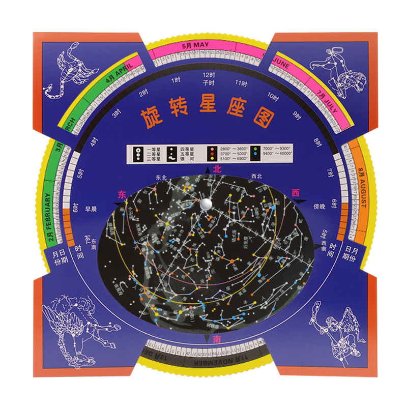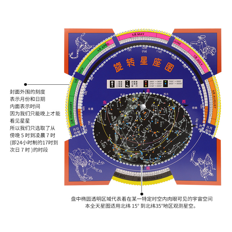 旋转星图的使用方法非常简单,此款是由两个圆盘所组成,在下面的大圆盘最外侧是印上日期,迭在上面的小圆盘则写上时间。