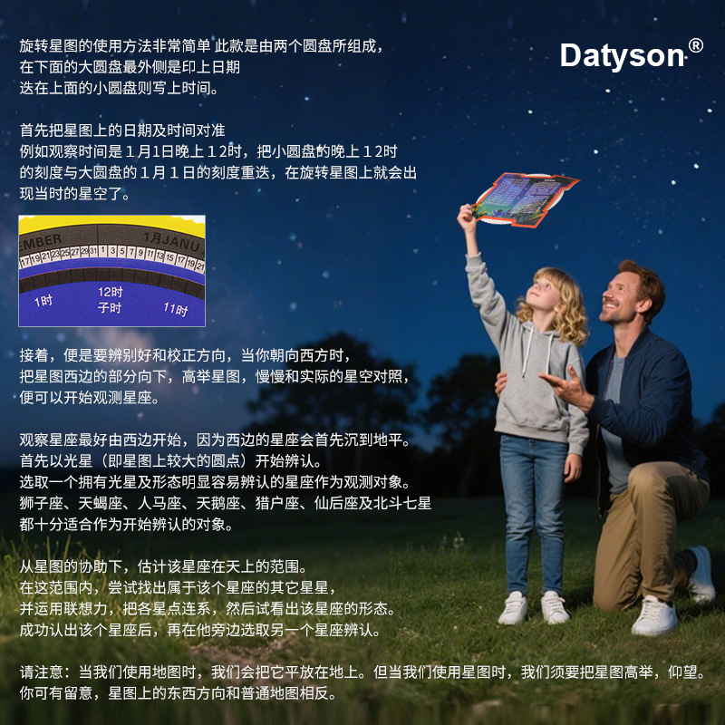 首先把星图上的日期及时间对准,例如观察时间是1月1日晚上10时,把小圆盘的晚上10时的刻度与大圆盘的1月1日的刻度重迭,在旋转星图上就会出现当时的星空了。