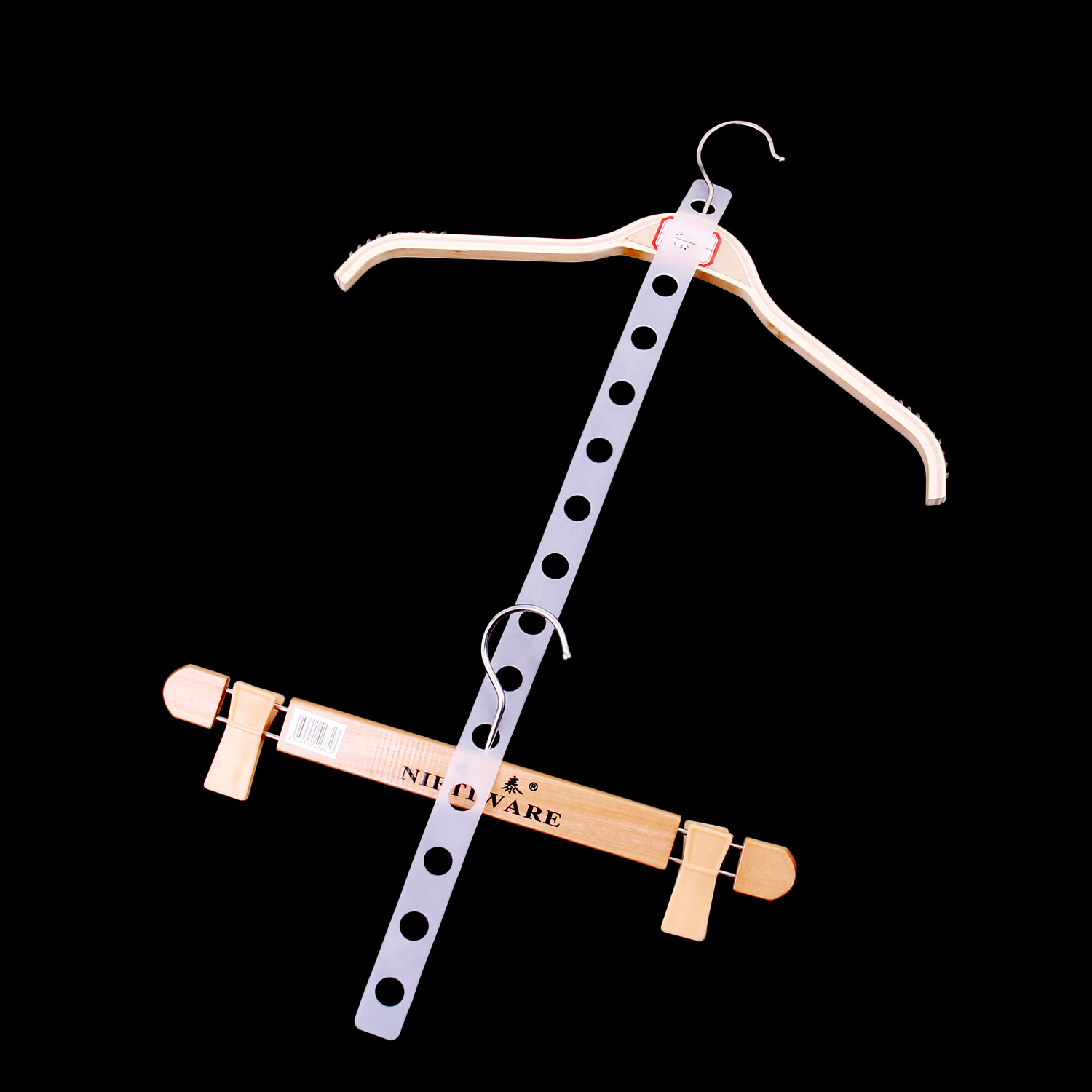 先将上面的孔穿过衣架的挂钩,套上衣服后裤架 挂在下面合适的位置 |