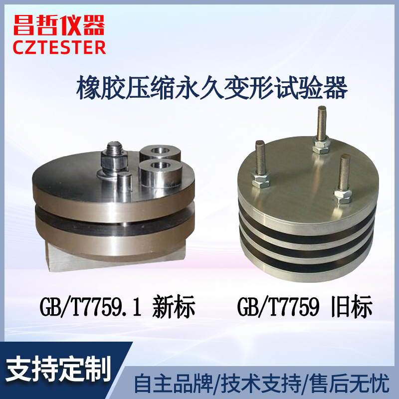 CZ-3013试验器由平行钢板、限制器和紧固件组成,符合 GB7759 、 ISO815等相关标准要求,用于硫化橡胶,热塑性橡胶或泡沫在常温、高温和低温条件下,以一定压缩率,经一定的压缩时间后测定橡胶变形量。