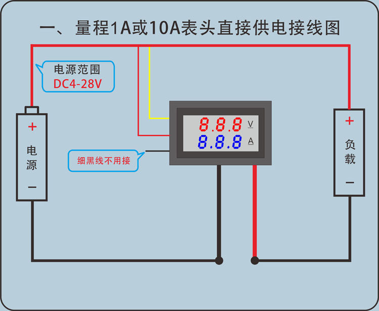 确保粗黑线是接到电池的负极,粗红线接到负载的负极。(注意放电跟充电的接线不一样,见Z后关于负载和电源的概念)。(表头使用原装进口芯片,出厂时经过非常严格的测试与校准,保证.没质量问题才出厂。遇到电流显示0的情况99.99%是接线不对,请耐心细心检查接线)