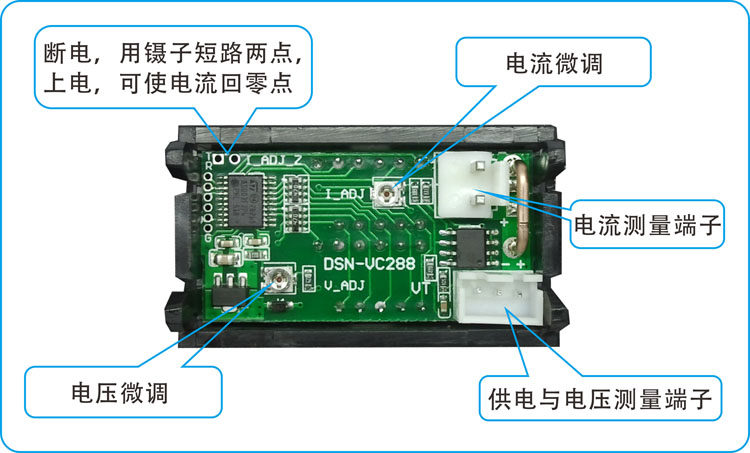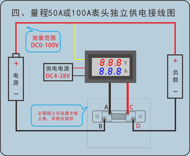 10A电压电流表头本身内置分流器了,50A/100A电压电流表头需要另外购买(以上选项可以勾选购买 )分流器(注意在接电源之前必须先接分流器)