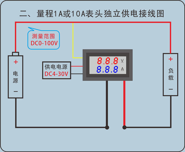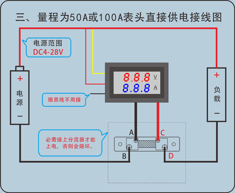 不接分流器,接细红线和细黑线到电源,量程为50A的表头电流显示50.0~59.9,量程为100A的表头显示100~109;