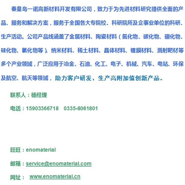 4.秦皇岛一诺高新材料开发有限公司,致力于为先进材料研究提供全面的产品、服务和解决方案,服务于全国各大专院校、科研院所及企事业单位的科研、生产活动。公司产品线涵盖了金属材料、陶瓷材料(氮化物、碳化物、硼化物、硅化物、氧化物等)、纳米材料、稀土材料、晶体材料、镀膜材料、溅射靶材等多个产业领域,广泛应用于冶金、石油、化工、电子、机械、汽车、电站、环保及航空、航天等领域,助力客户研发、生产高附加值创新产品。