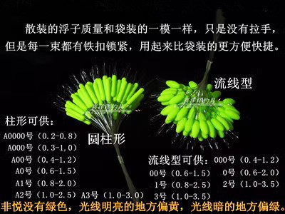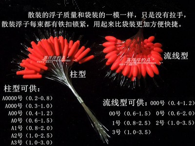 非悦浮子5号整盒40袋(比较大),其他号都是50袋!非悦散装浮子和袋装的相比就是没有拉手,质量都是一样的,渔具店自制主线使用更加经济实惠。非悦散装优质硅胶太空豆每束100枚,具有同心度高、锁线紧、不伤线、耐老化的特性,最主要的是采用了量贩装,好质量的同时又大大节约了使用成本,是渔具店和钓鱼爱好者的好选择!