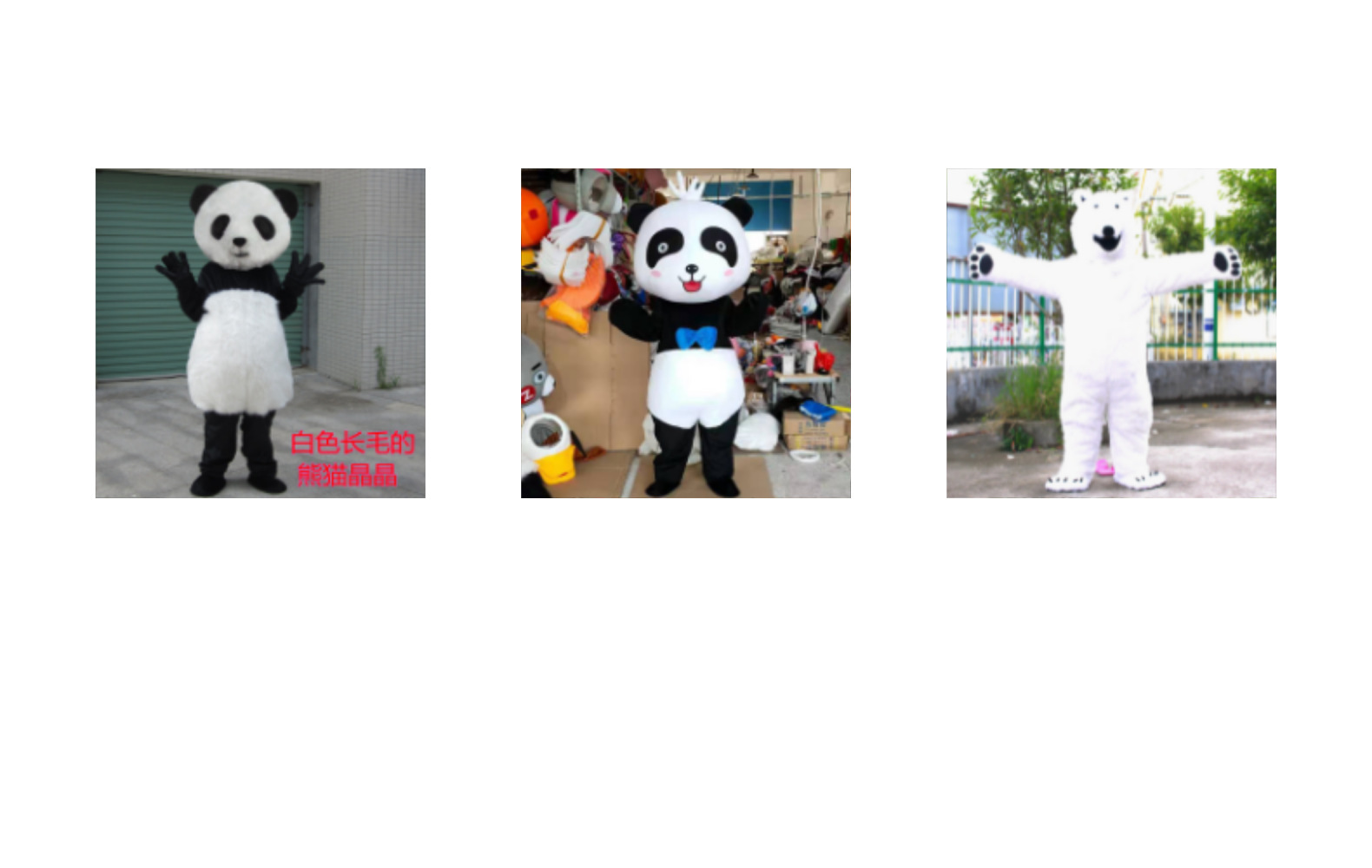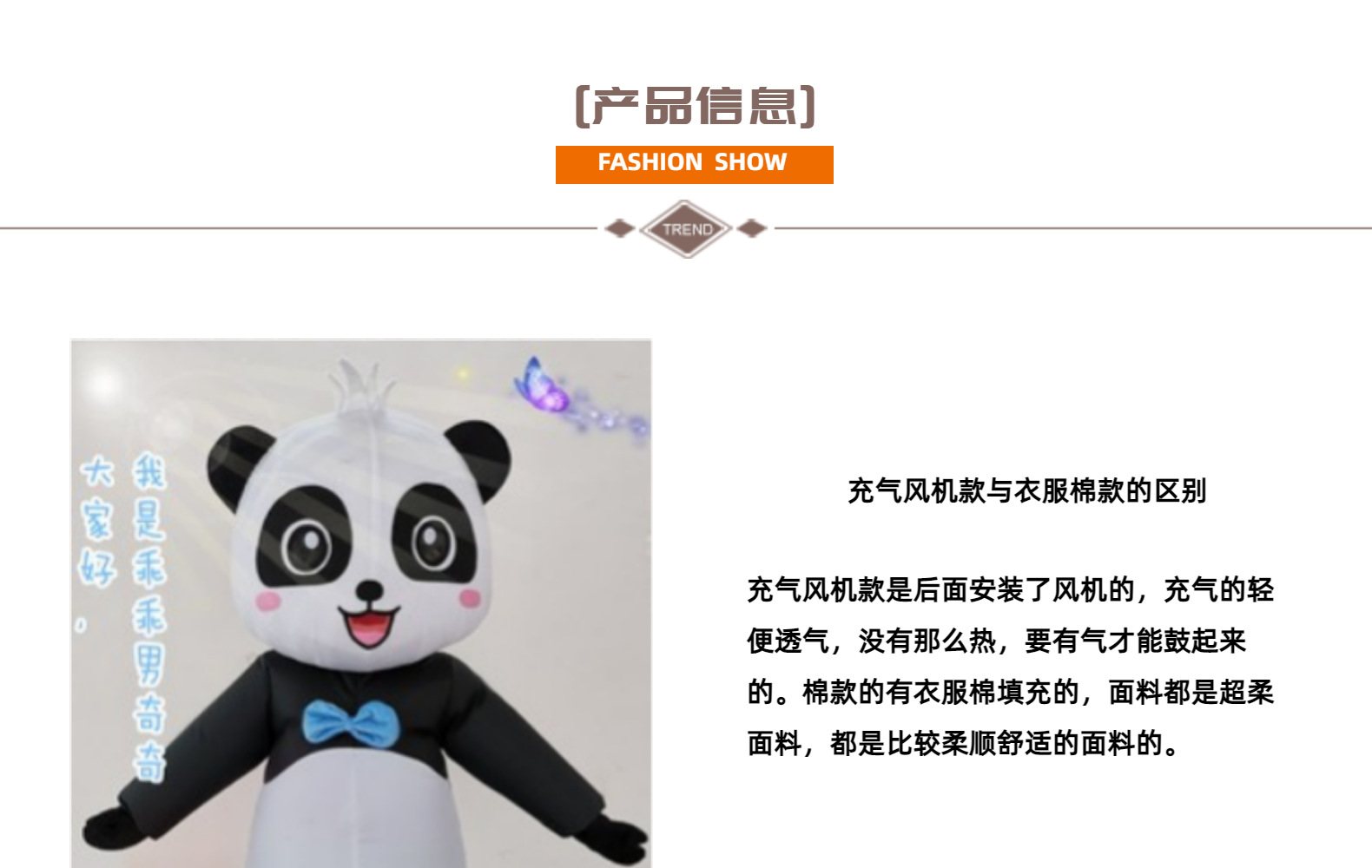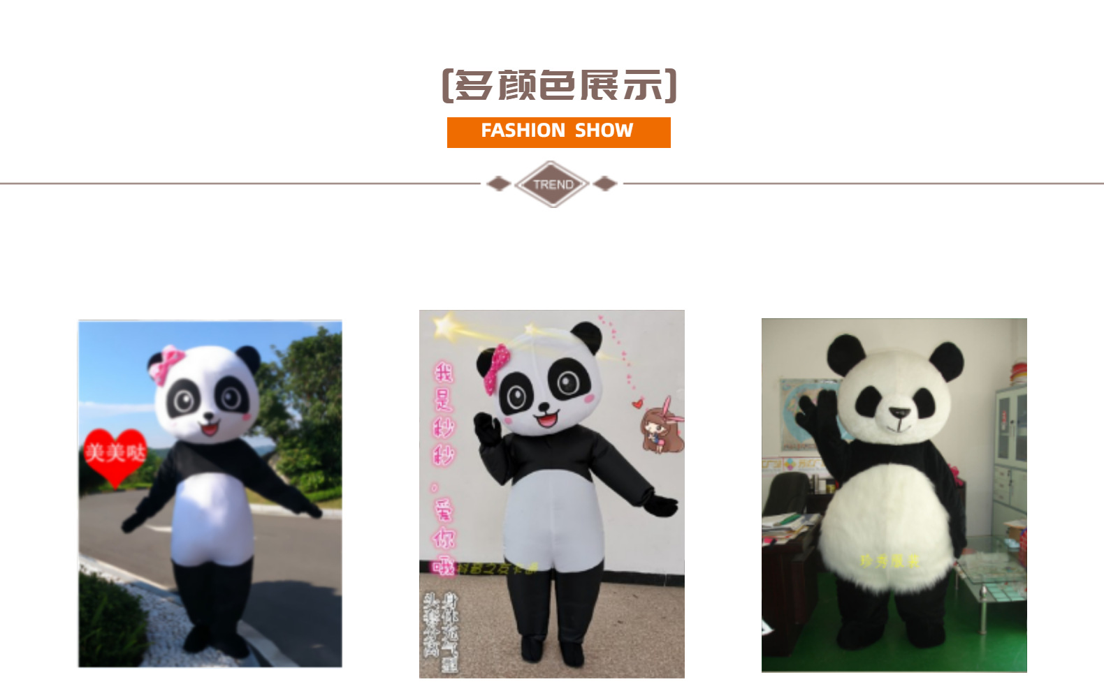 Большая голова милая панда; Длинношерстный кристалл панды; Белый медведь; Волосатая панда; Полярный медведь второе издание; Надувная большая голова милая панда; Симпатичные панды; Милый медведь и кошка; Надувной мужской панда; Надувной женский панда; Надувной ремень панды розовый; Надувной ремень панды синий
