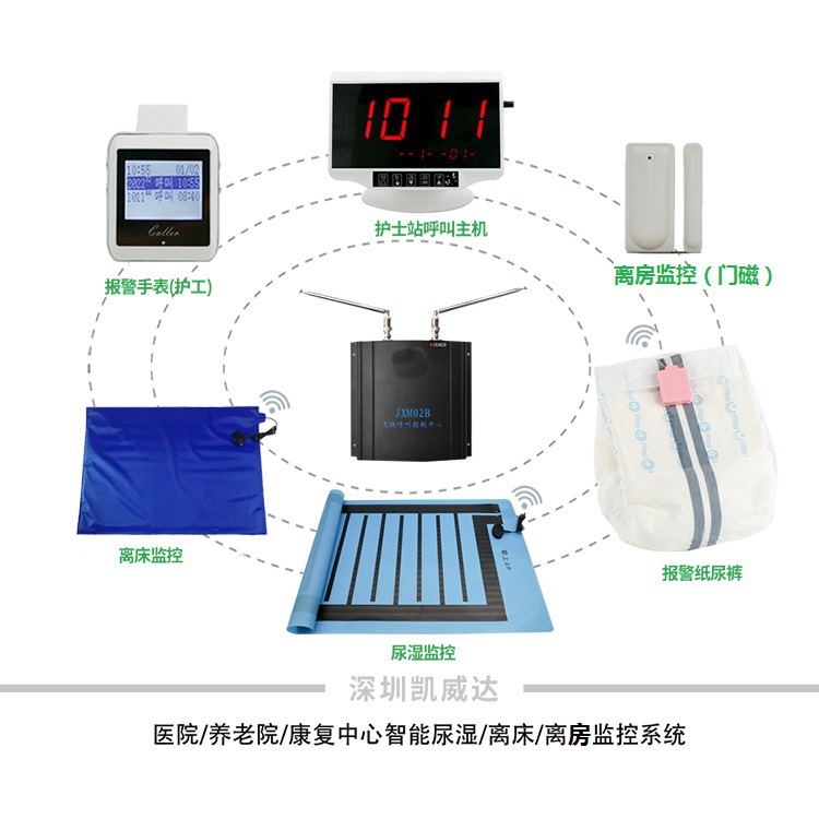 特地针对医院养老院瘫痪失禁人员的尿湿监控系统由尿湿感应垫,专用一次性纸尿垫或者可循环使用布尿垫,尿湿感应发射器,手表式报警器等组成,为了养老院等机构无线信号覆盖,可以根据环境需要,适当增加信号放大器来满足感应距离的需求。