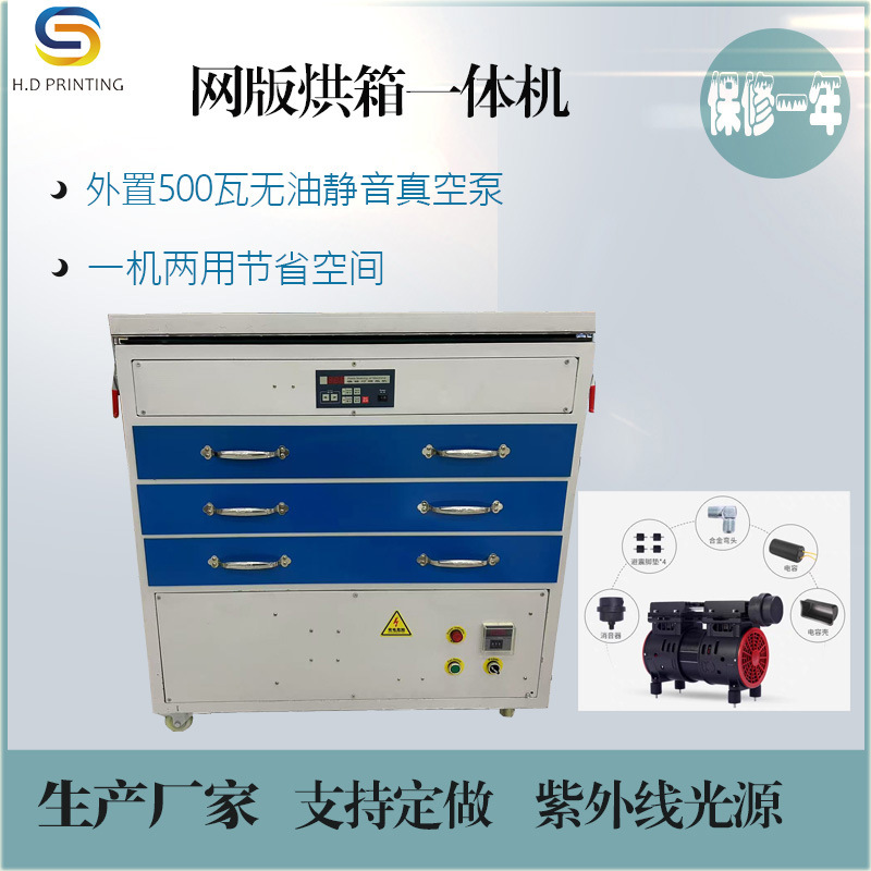 性能特点:该机是真空吸气晒版机和网版烘 干机为一体的多功能机,晒版时 间是数控吸气,烘版机温度可恒 -温自控调节。