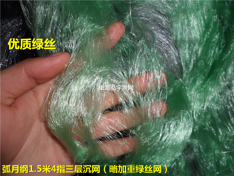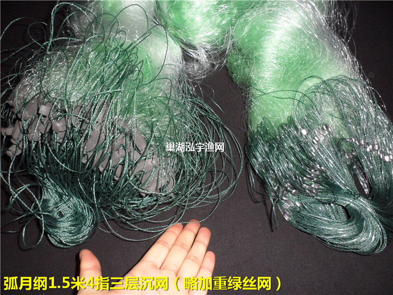 渔网规格:1.5米高、内网眼4指、65米长、三层沉网(弧月纲“好收网”、加重绿丝网)