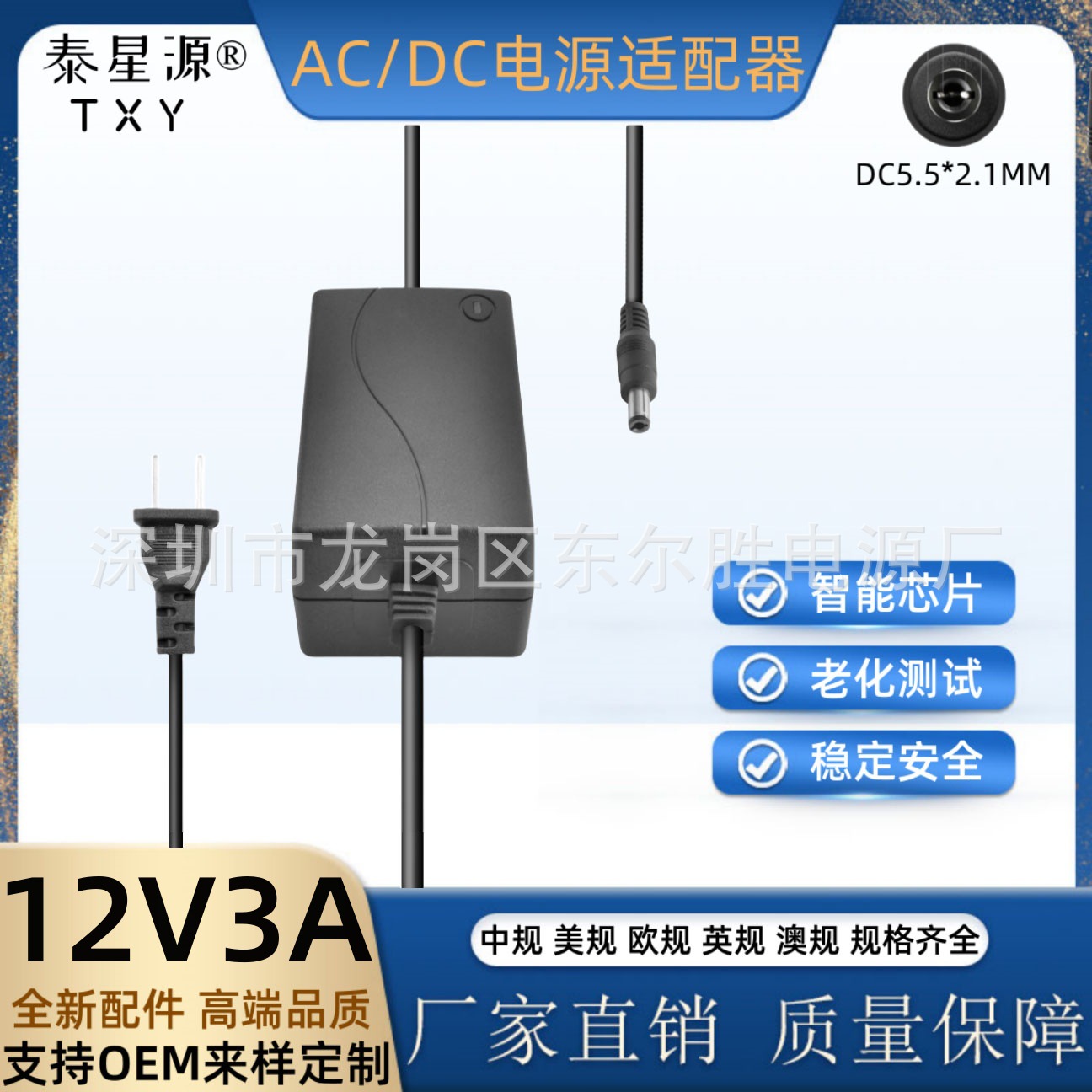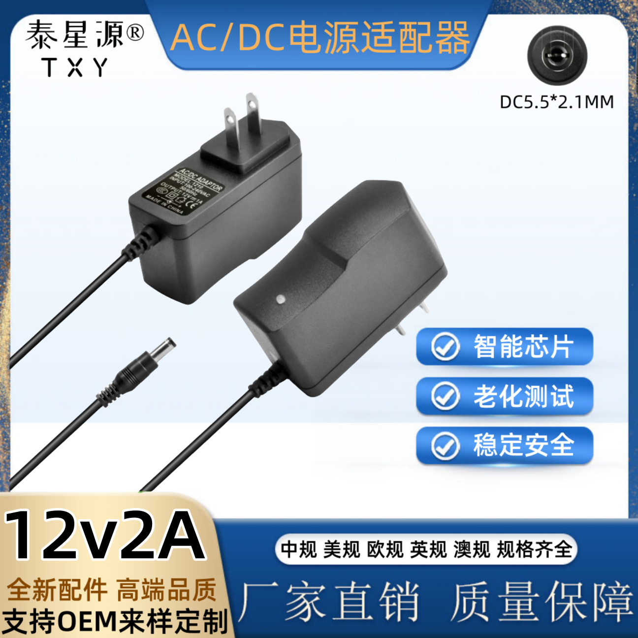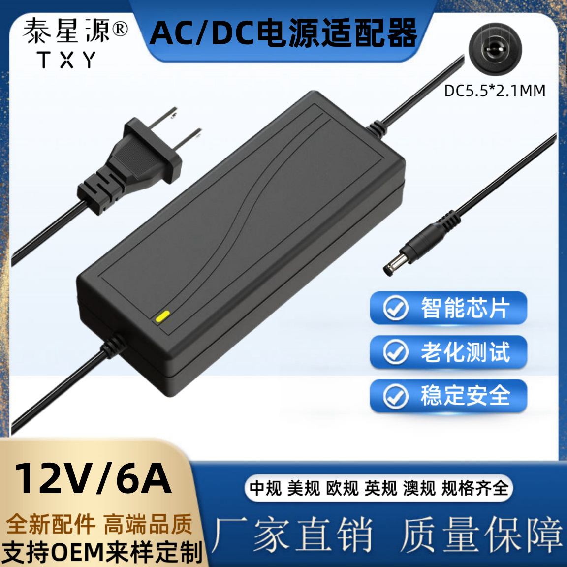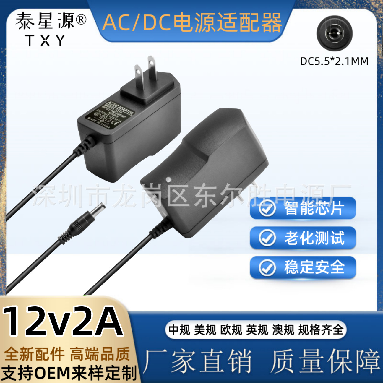 输出线长:插墙款一米,桌面式AC0.5米,DC1米