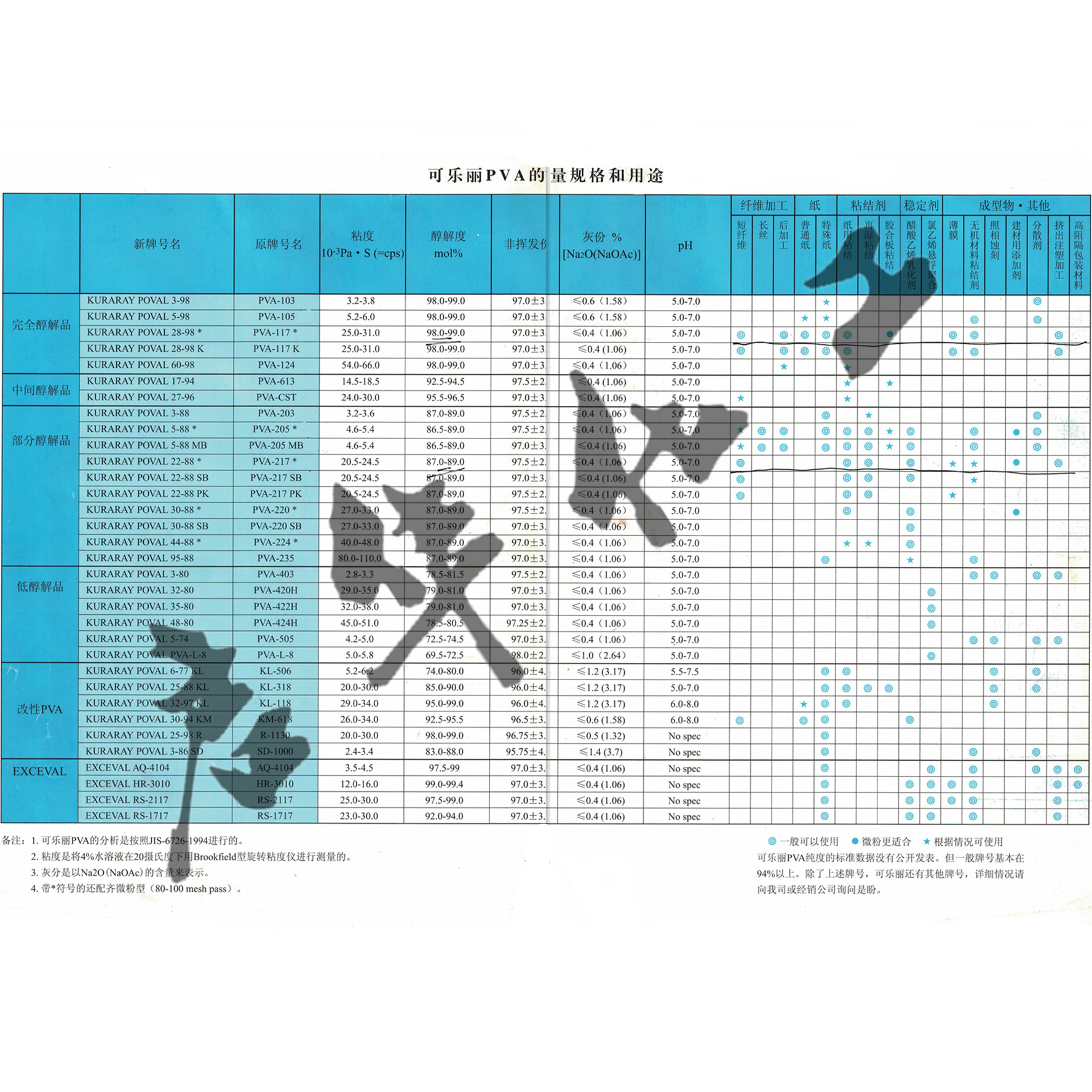 可乐丽PVA是白色粒状的水溶性合成树脂。化学名称为Polyvinyl alcohol,简称PVA。PVA的主要性质是由于构成树脂的分子的醇解度和聚合度而定的。并具有如下性质: