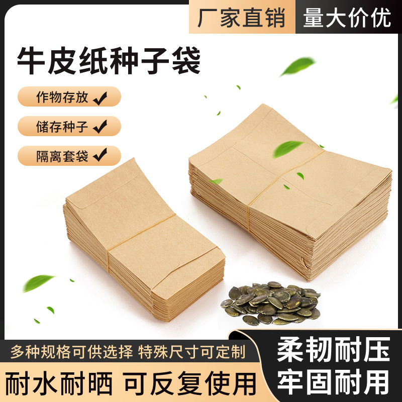 该产品用牛皮纸袋缝制而成,适用于玉米、麦类、油菜、水稻、高梁、烟草、向日葵、蔬菜等作物存放用可以用来做包装种子的小袋,也可以用于作物授粉时作隔离套袋用,特殊规格均可生产。量大优惠。