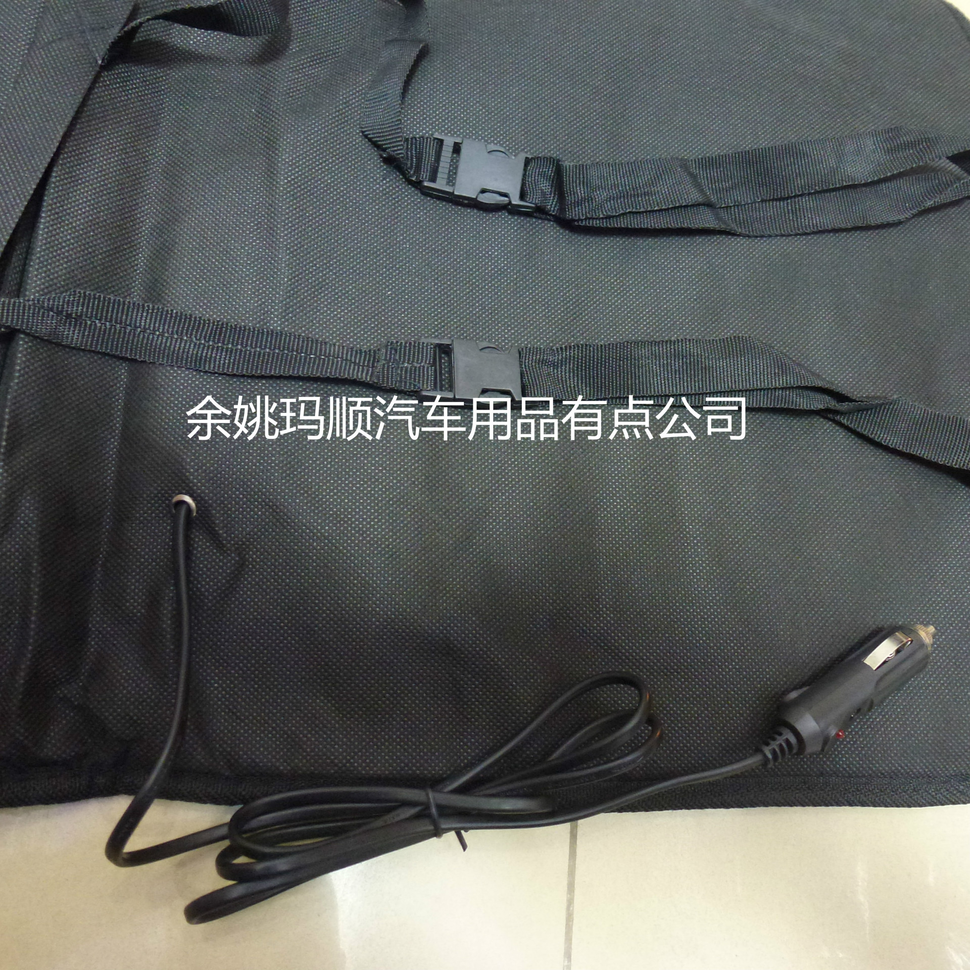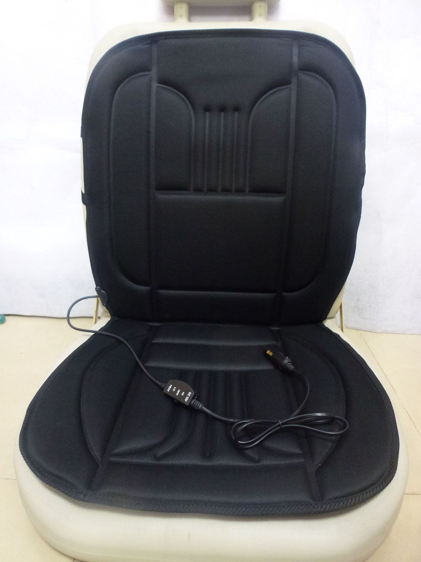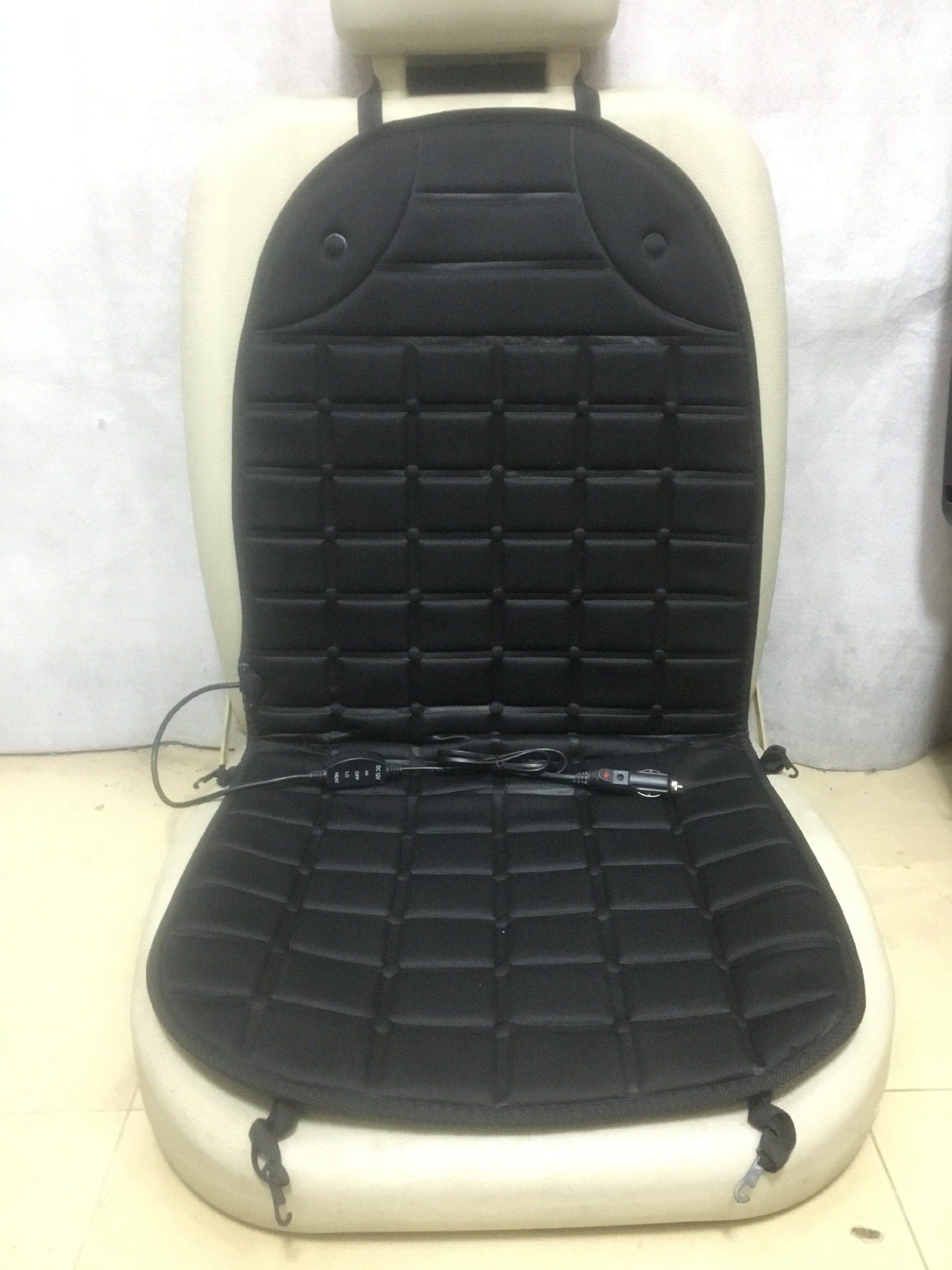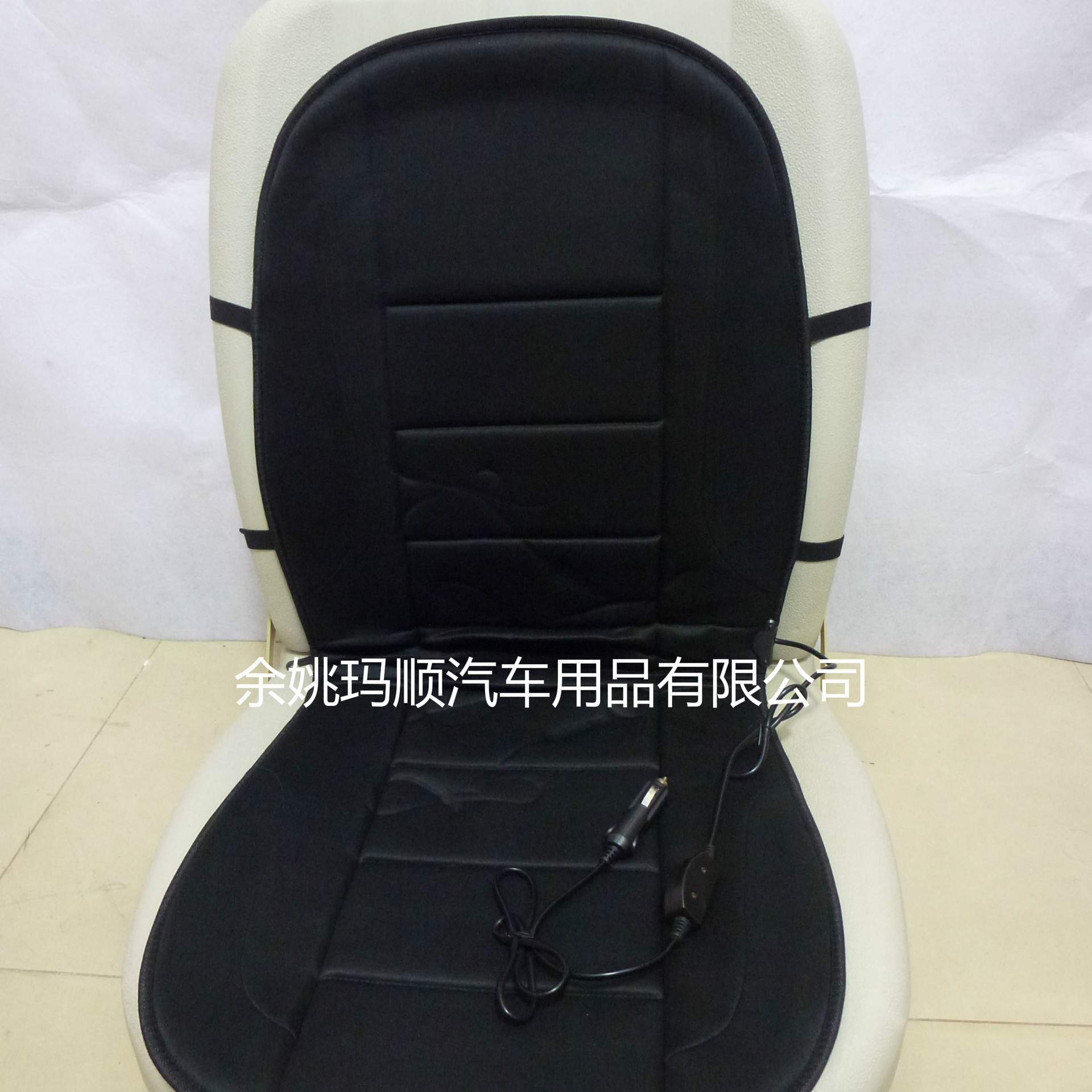 1、将产品附有的弹力带套进座椅头枕支柱上,把坐垫电源插头插入汽车 的点烟器。