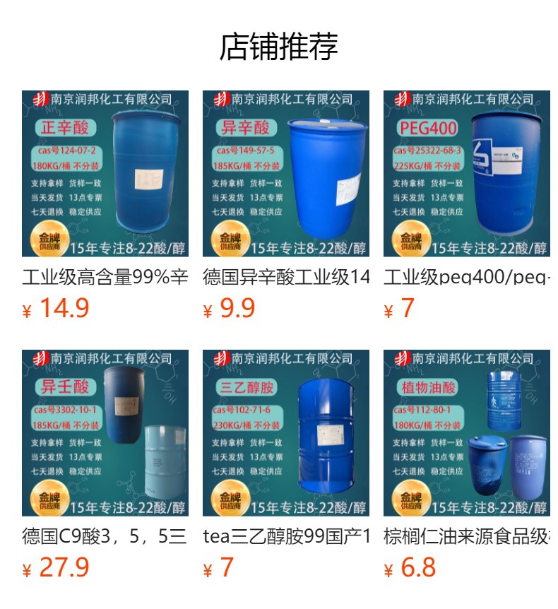 - 在与新戊醇、季戊四醇、三羟甲基丙烷等多元醇反应合成酯时,要比直链酸和异构酸具有更好的水解稳定性!同时,由于新癸酸多支链化的分子结构特点,用新癸酸合成的酯具有更好的耐低温性和耐高温型。因此,它可以用于合成耐低温和耐高温的润滑酯。