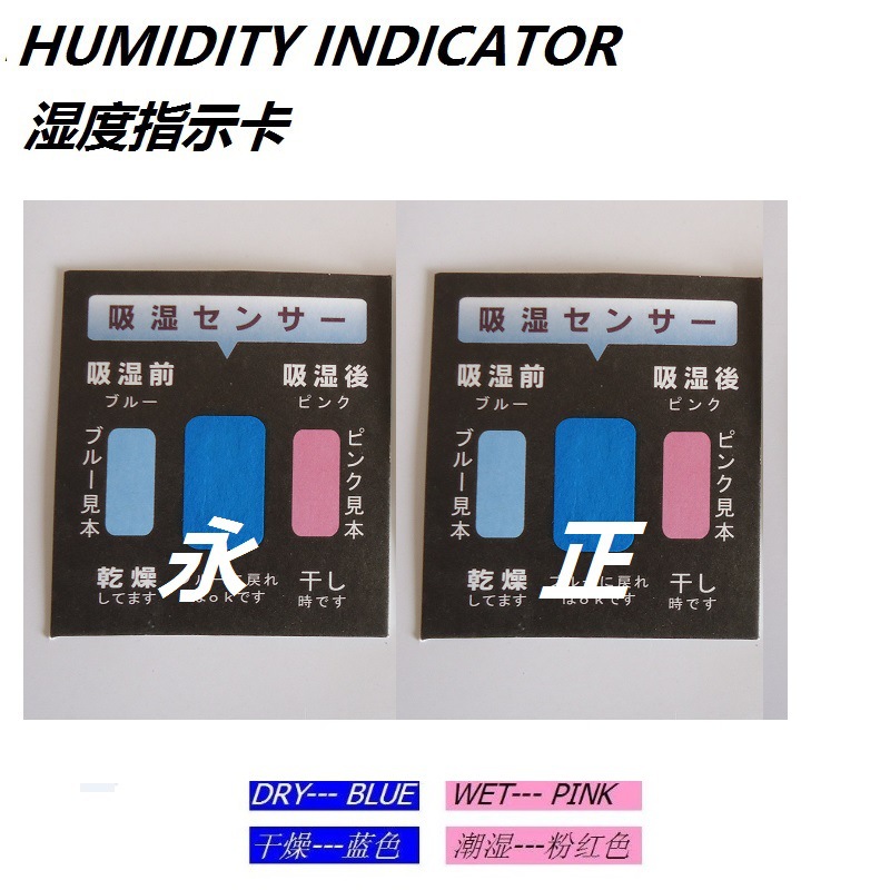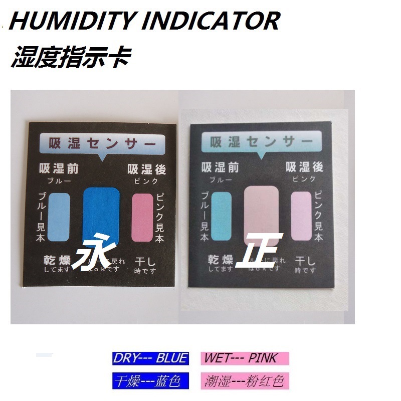 濕度指示卡(Humidity Indicator)是張可視卡片,使用者可以通過卡片上面的標示顏色的變化迅速判斷產品包裝內環境濕度情況及乾燥劑的使用狀況。卡片中每個圓點分別表示一個濕度值,隨著環境相對濕度值的變化分別由蓝色逐漸變成粉红色,可以確定環境的相對濕度值,以幫助確定乾燥劑是否需更換。