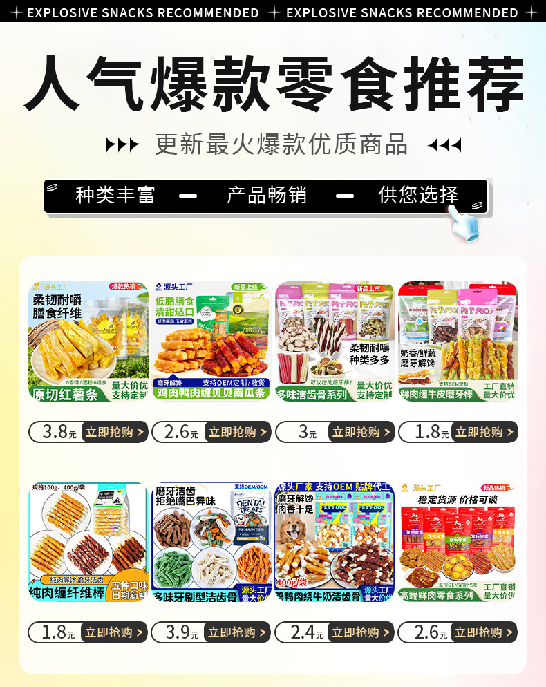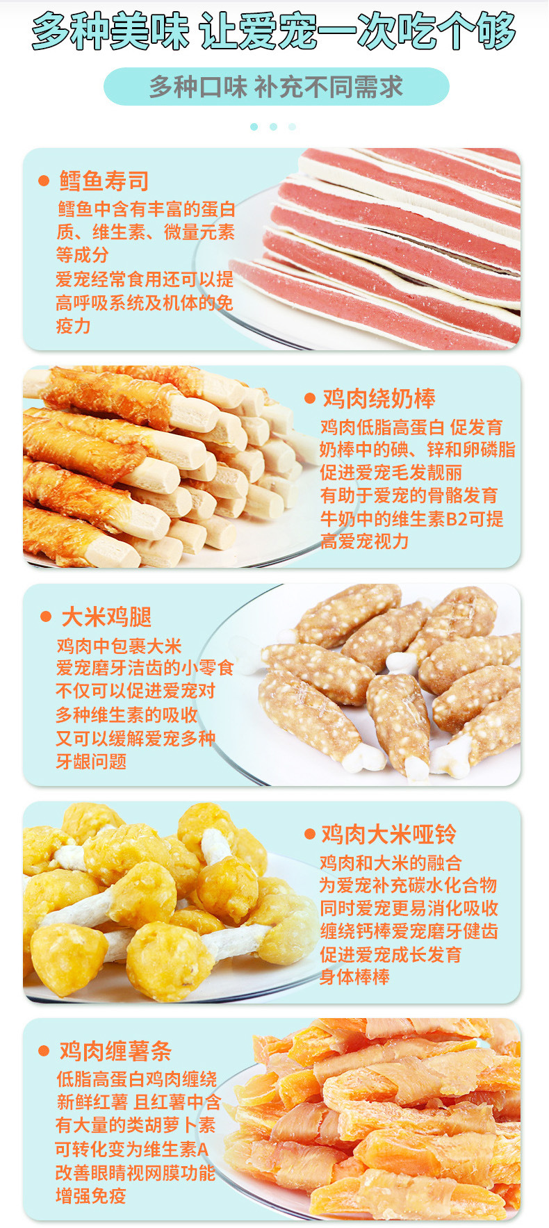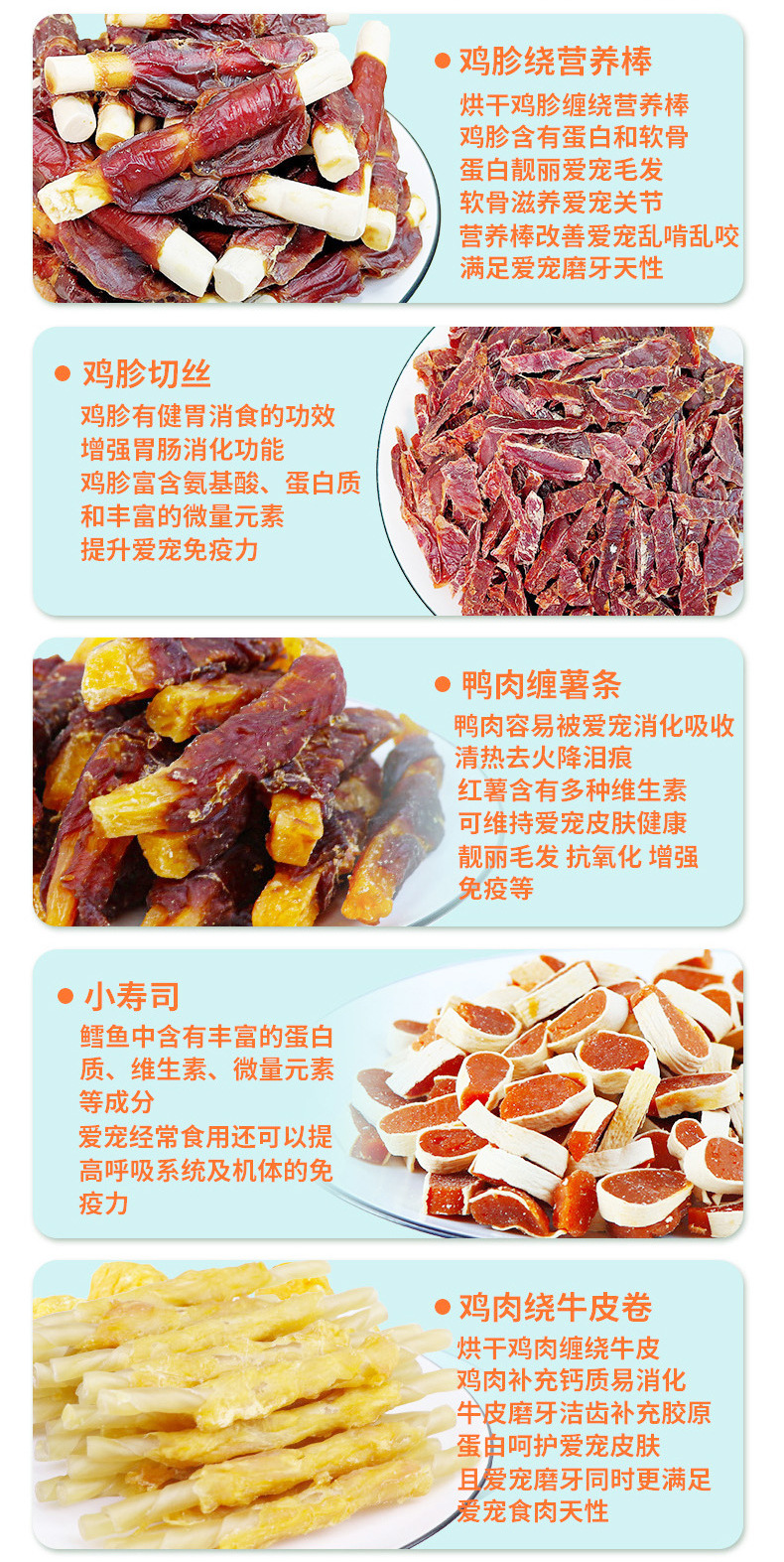 сэндвич; маленькие суши; Курица, завернутая в кусочки картофеля; куриные голени; гантель; Питательный батончик с куриным фаршированием; Печенье с курицей; Композитный рулон с говядиной, обернутый курицей; Утиное мясо, завернутое в молочные кости; Куриные грильчики, обернутые питательными батончиками; Тертые куриные грижи; Курица, обернутая двойным картофелем фри; Утка, завернутая в двойную картофель фри; Сырные палочки с курицей; Сырные палочки в обертке из утки; Курица, завернутая во фри; Утка, завернутая во фри; Курица, обернутая полосками тыквы; Утиное мясо, обернутое полосками тыквы; Курица, обернутая в молочную говяжью кожу, на палочках; Утиное мясо, обернутое в молочную говяжью кожу.; Курица, обернутая свежими овощными палочками из говяжьей кожи; Утиное мясо, обернутое свежими овощными палочками из говяжьей кожи